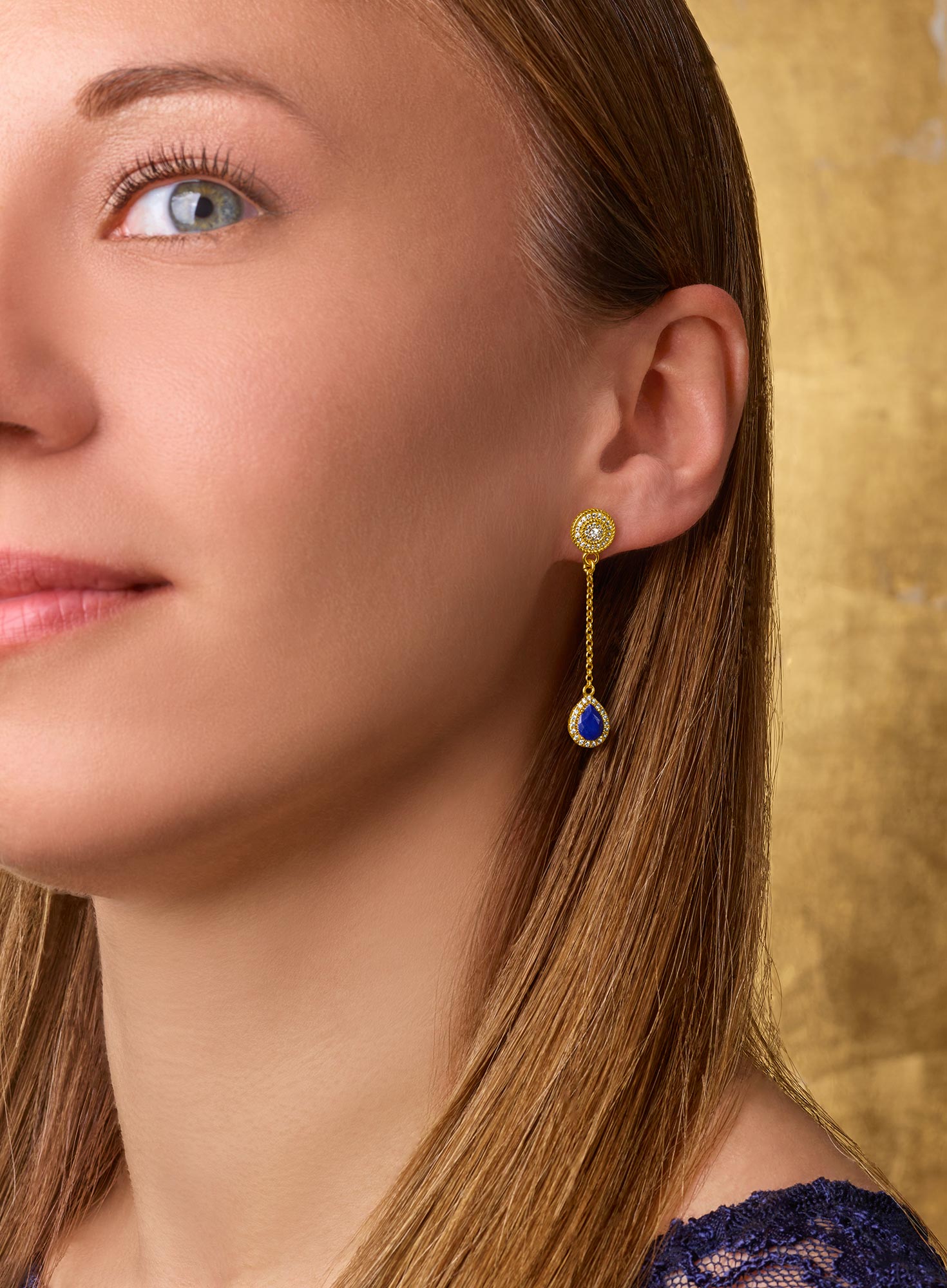 Der kostbare, ultramarinblaue Lapislazuli in der von BERND WOLF verarbeiteten exzellenten Qualität erinnert an einen leuchtenden Nachthimmel und harmoniert perfekt mit der 24-Karat-Goldplattierung der BERND Wolf Manufaktur. Weitere Infos zu den von BERND WOLF verwendeten Materialien im Lexikon der Edelsteine.