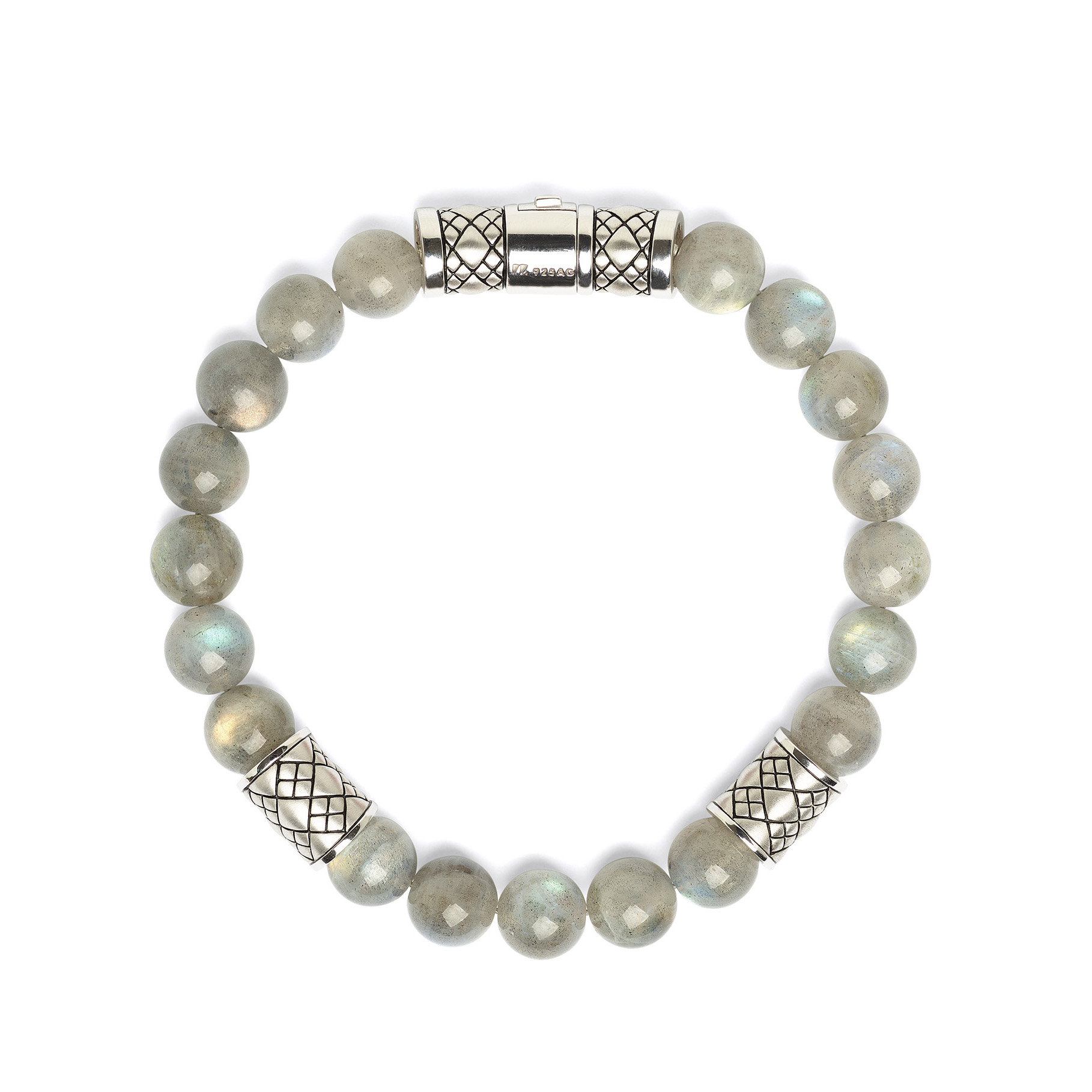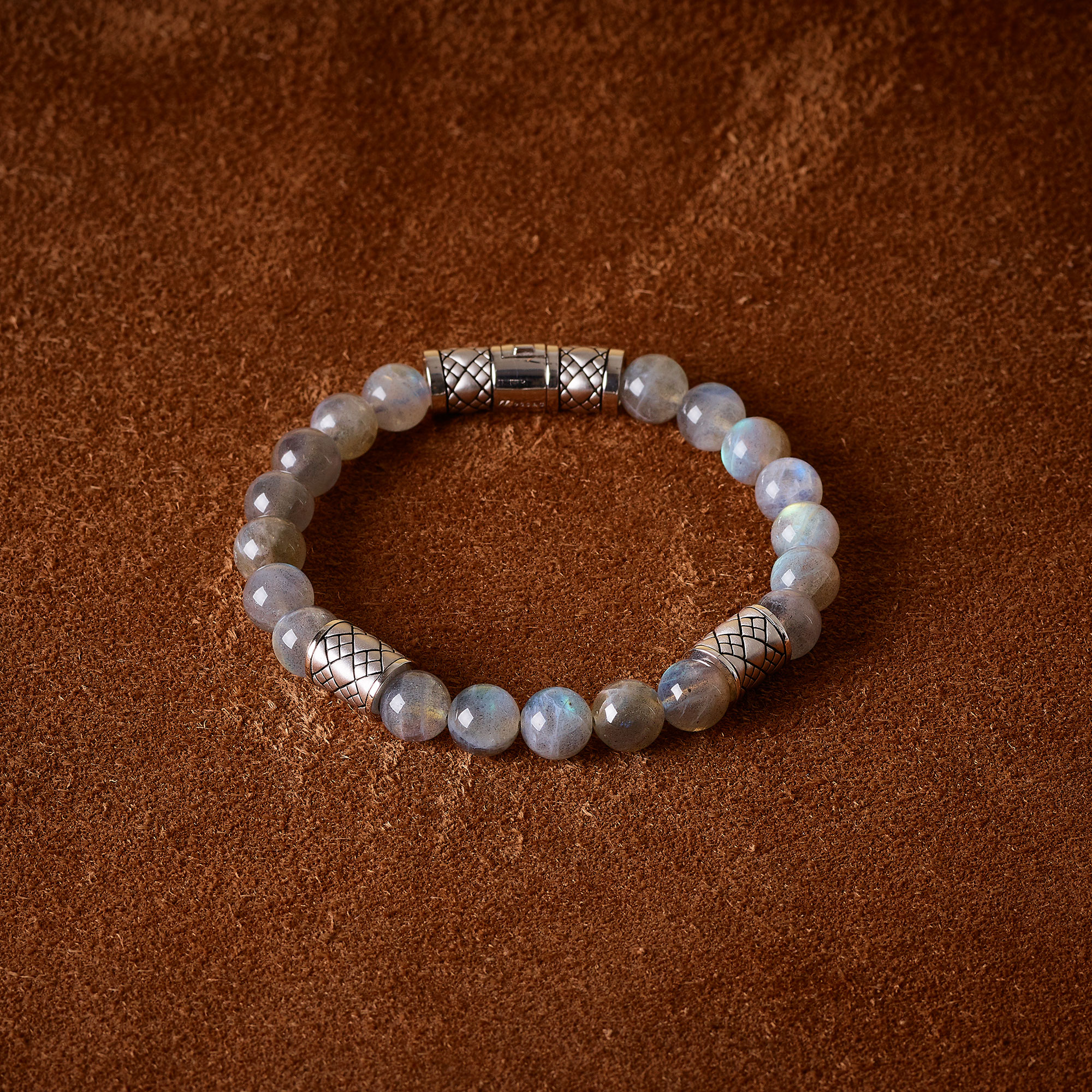 Der Labradorit bezaubert durch sein lebhaftes Farbenspiel. Durch Reflexion und Absorption erscheinen je nach Blickwinkel und Lichteinfall verschiedene Farben. So passt sich der Edelstein den Farben der Kleidung an. Weitere Infos zu den von BERND WOLF verwendeten Materialien im Lexikon der Edelsteine.