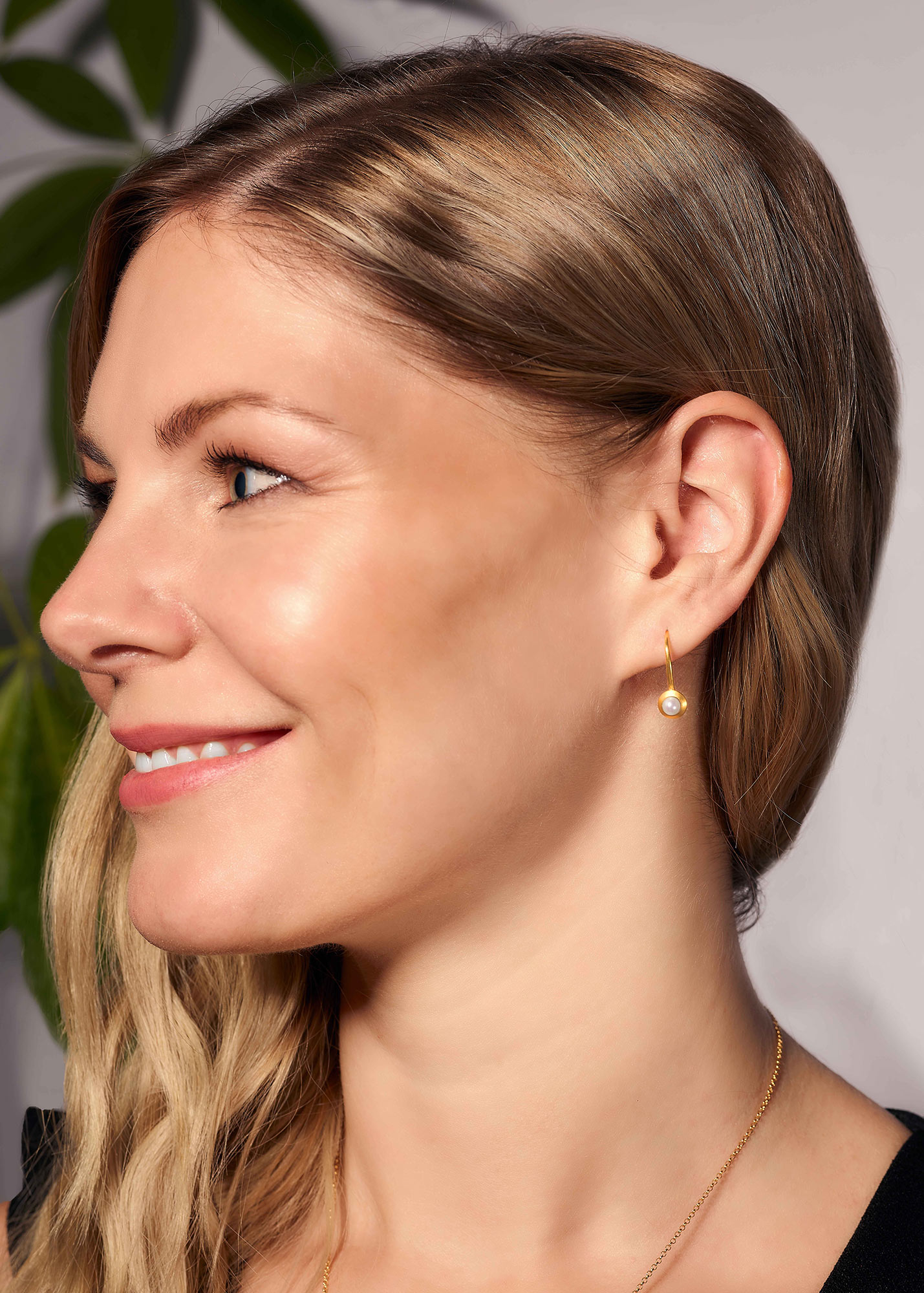 Schlicht und schön. Der Ohrhänger Banno ist das perfekte Schmuckstück für Frauen, die dezenten und aparten Ohrschmuck mögen. Eine kleine edle Süßwasserperle mit edlem Lüster in einem strichmattierten Rahmen mit sonnigem, warmem Goldton, der die BERND WOLF 24-Karat-Plattierung in Premiumqualität auszeichnet. Der Fischhaken unterstreicht die Leichtigkeit und den eleganten, luftigen Look.