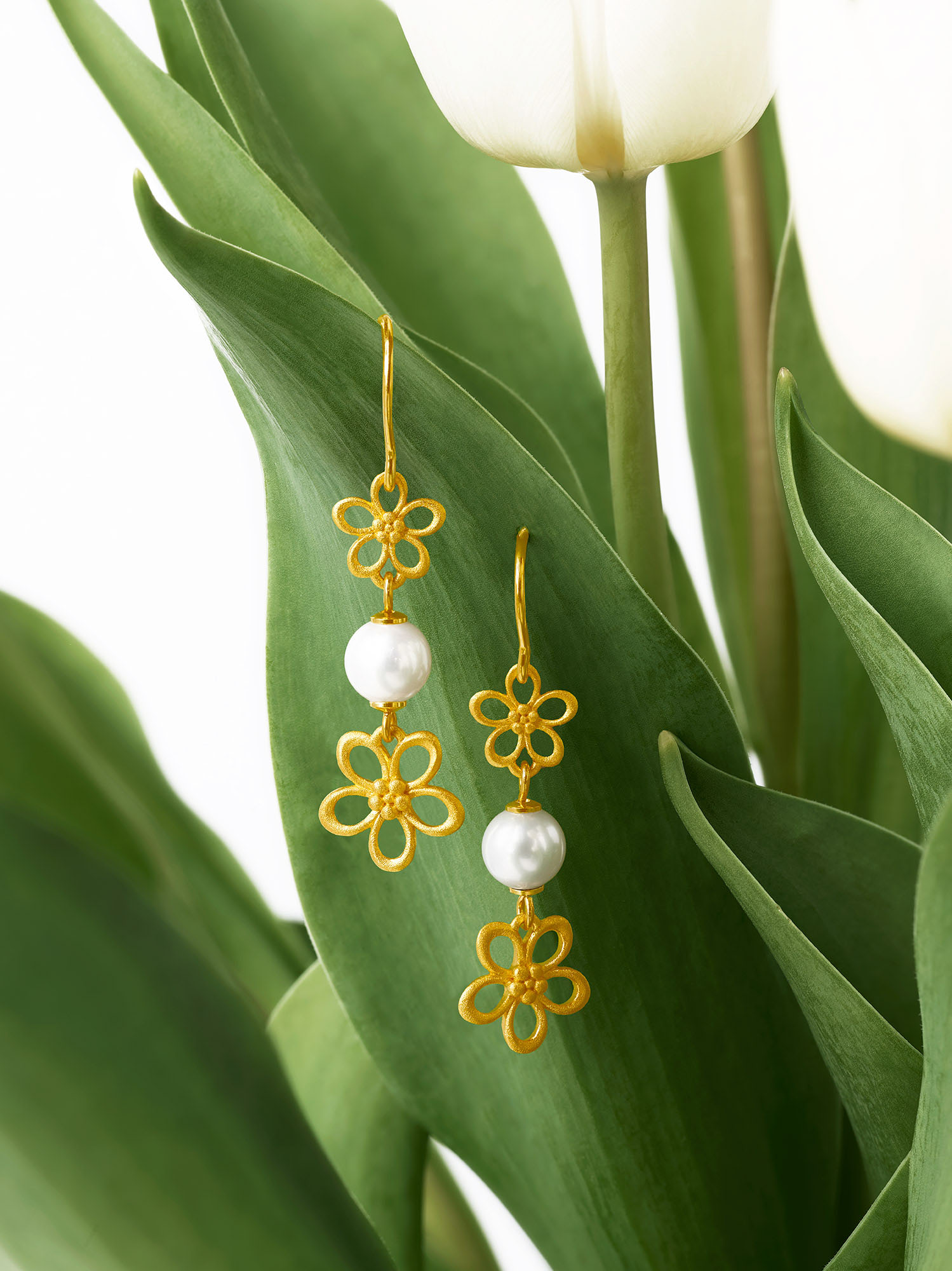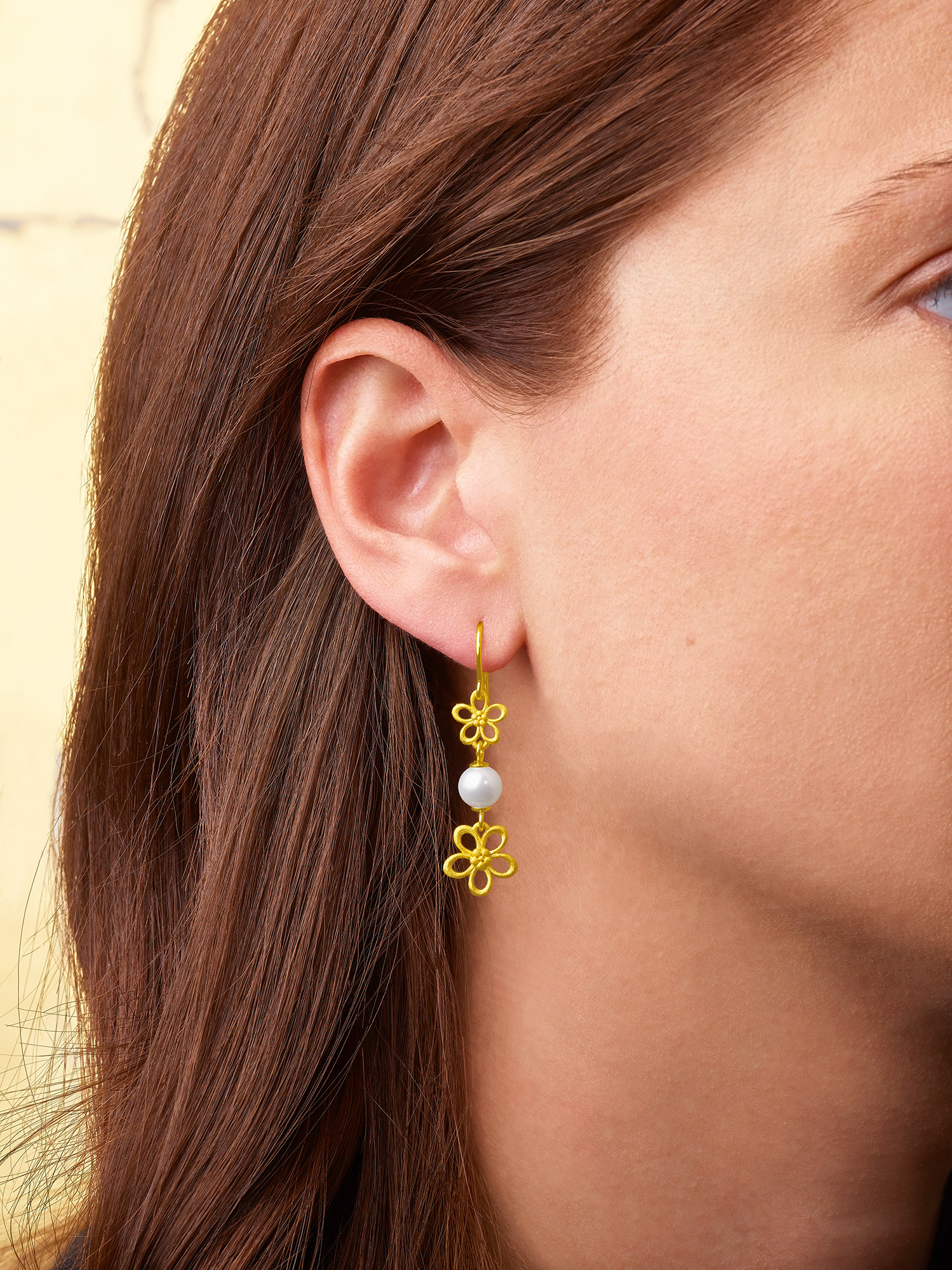 Für Liebhaberinnen von Ohrhängern mit Fischhaken sind die Ohrhänger Cercala von Designerin Yvonne Wolf ein absolutes Highlight. Runde Zuchtperlen mit sanft schimmernden Lüster geben dem verspielten und romantischen Ohrschmuck ein feminine Note. Edle Materialien und grazile Leichtigkeit - die kleinste Bewegung lässt die filigrane Blüten tanzen. Die Ohrhänger sind die perfekte Ergänzung als Seit mit der Halskette Cerosa.