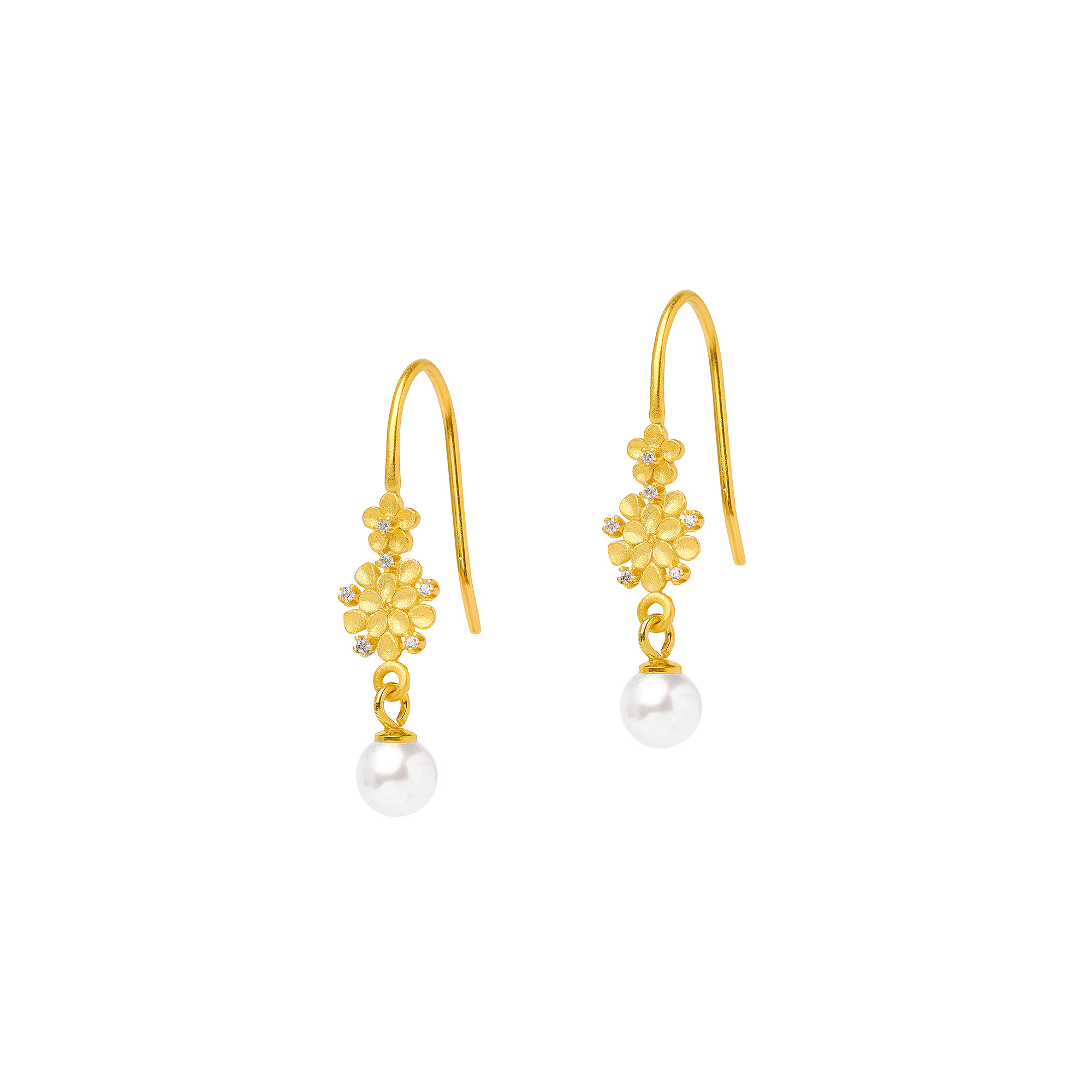 Die Ohrhänger Ceriso bezaubern mit duftiger Leichtigkeit. Fünfblättrige Kirschbüten als Symbol für Frühling und Neubeginn lieferten Yvonne Wolf die Inspiration. Kleine Zirkonia im Brillantschliff blitzen hell bei jeder Bewegung auf. Sanft schimmernde Zuchtperlen schwingen am unteren Ende. Ihr edles Lüster harmoniert wunderbar mit den Blüten in dem warmen, sonnigen Farbton der 24-Karat-Goldplattierung in Premiumqualität. Die Ohrhänger werden perfekt ergänzt durch das Collier Ceriso und den Ring Ceriso.