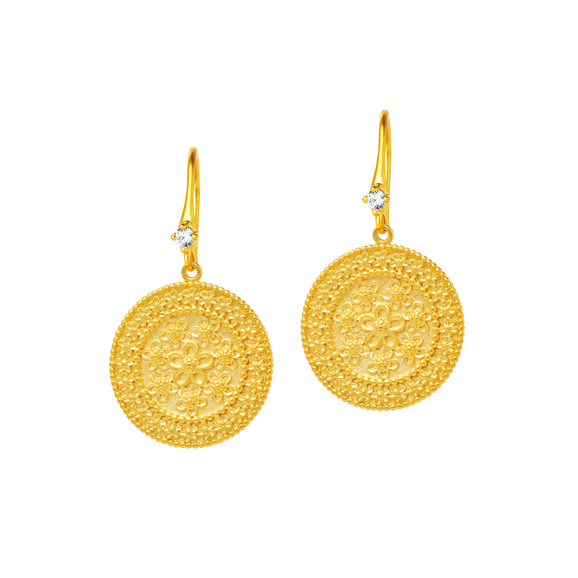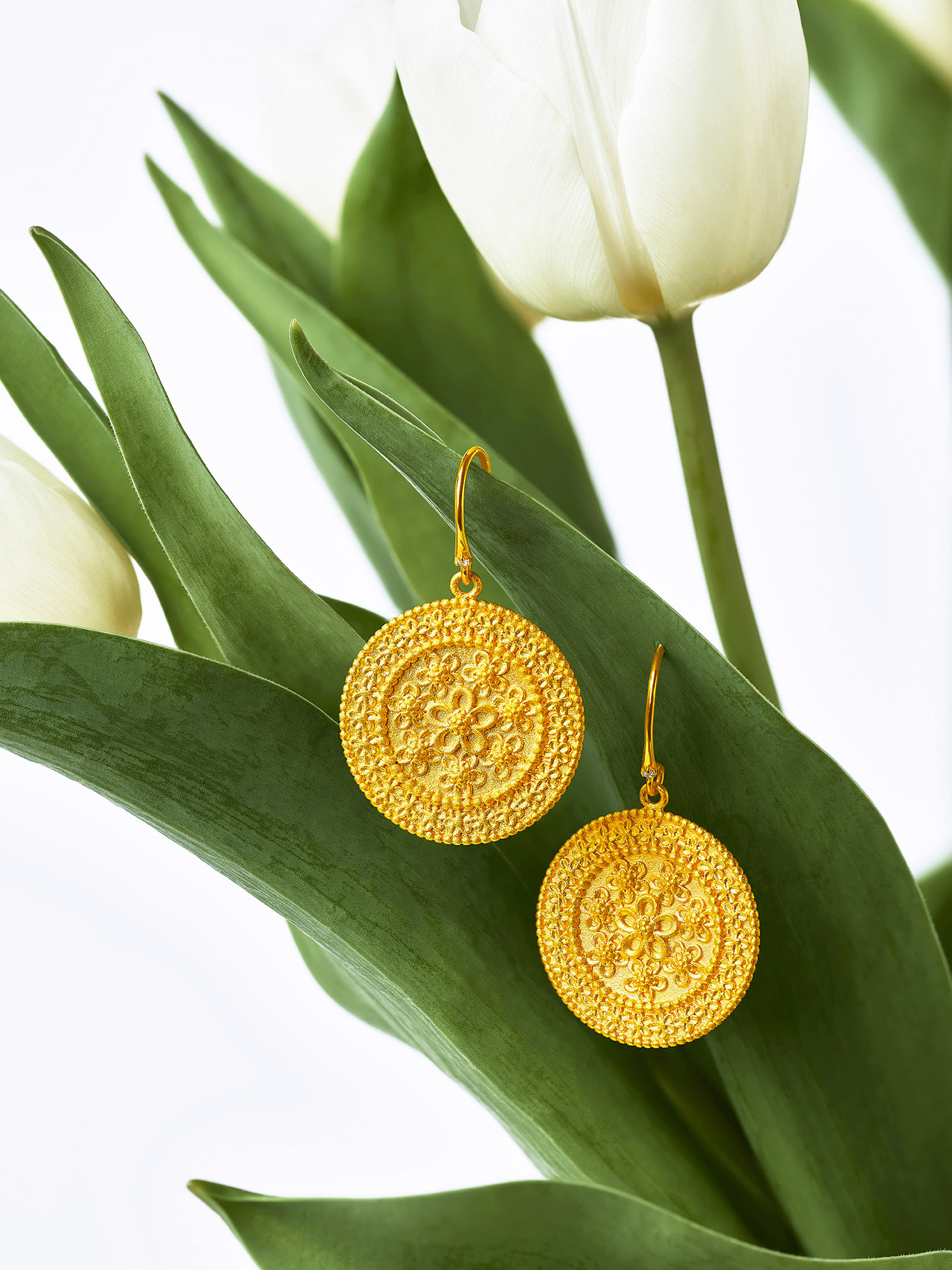 Die Ohrhänger Cerosanto sind eine Hommage an die Blütenpracht in Frühling und Sommer! Zwischen zwei Bändern aus runden Goldelementen tummeln sich zahlreiche unterschiedlich große, gefüllte und durchbrochene Blütenformen. Wie kleine Sterne leuchten die Blüten mit ihren durchbrochenen Blütenblättern der Designlinie Flowertime. Sie erwecken Bilder von blühenden Sommerwiesen.