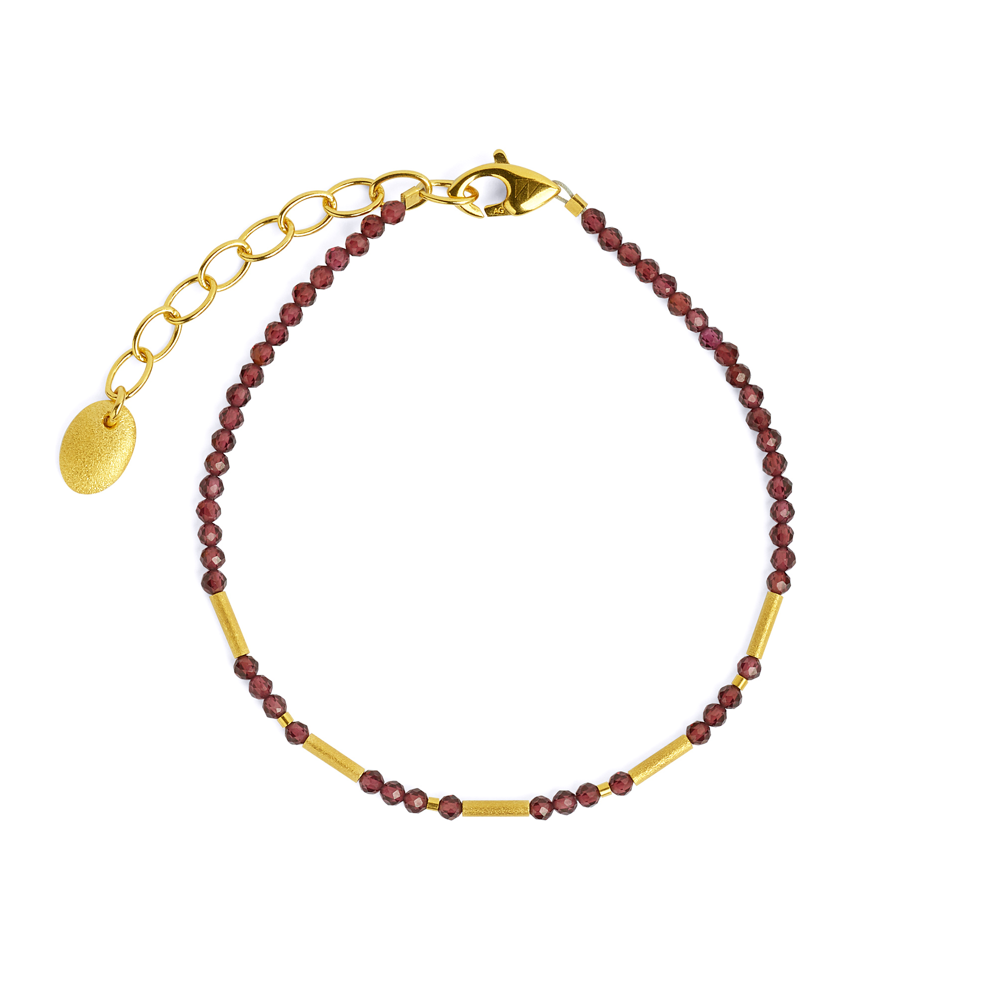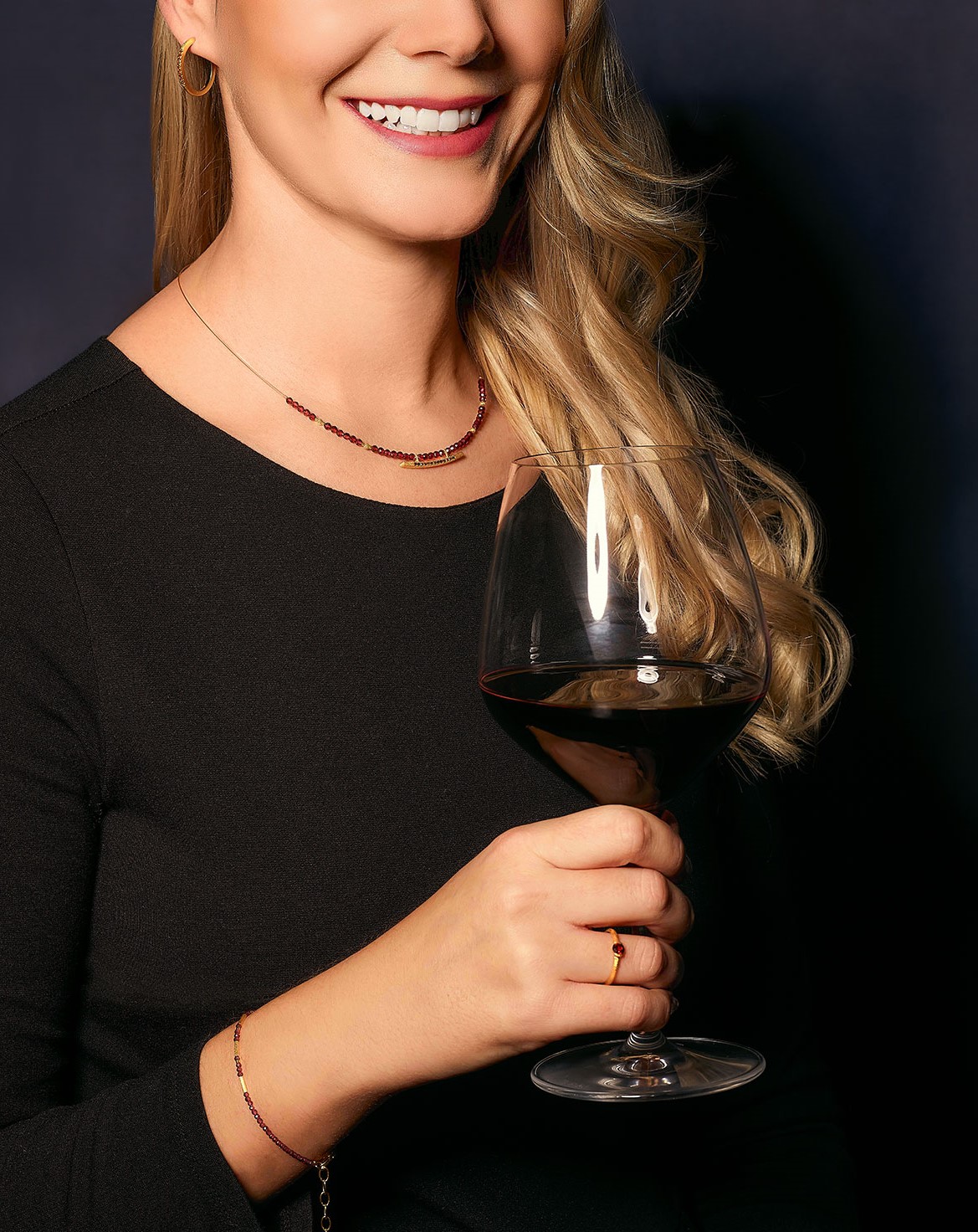 Die Armkette Clani ergänzt das Collier Clani zu einem harmonischen Set. Aber auch allein getragen überzeugt sie mit feinem Charme und der aufgelockerten Reihung von facettierten Kugeln aus magisch glitzerndem Granat und goldplattierten Röhrchen. Dank einer Verlängerungskette kann der Armschmuck in unterschiedlicher Länge angelegt werden und passt sich so jedem Handgelenk an. Ob zum kleinen Schwarzen oder zum eleganten Abendkleid, die Schmuckstücke aus der Designlinie Cleopatra sind wahre Eyecatcher. Ihr filigranes, fließendes Design unterstreicht den femininen Look und die Persönlichkeit der Trägerin in einzigartiger, harmonischer Weise.