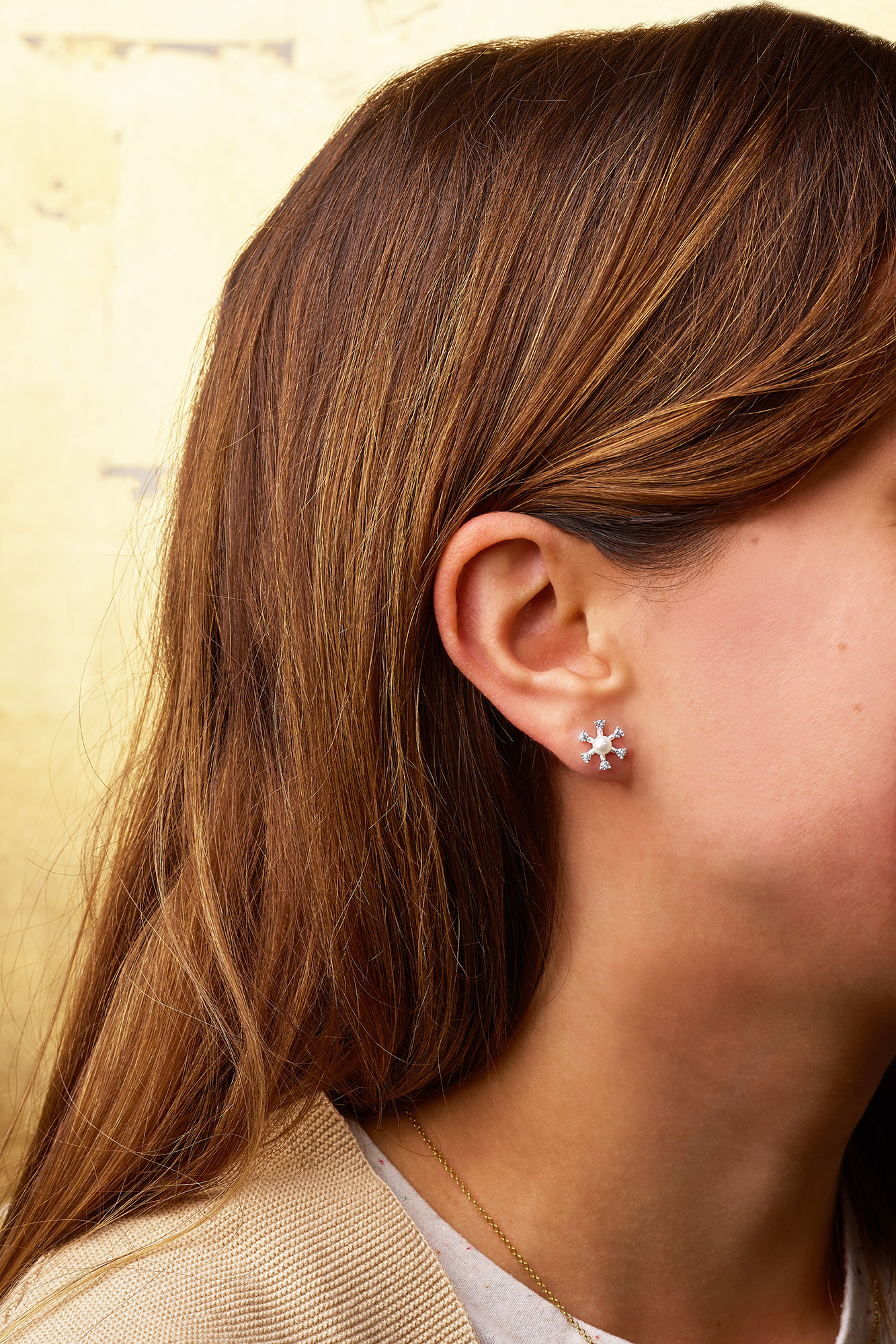 Wie ein kristallisierter Wassertropfen strahlen die Ohrstecker Crystalli und versprühen mit lebendigem Glitzern pure Lebensfreude. Von einer sanft schimmernden Perle in exzellenter Qualität im Zentrum gehen sechs Strahlen in dem herrlich warmen Weiß der BERND WOLF Feinversilberung aus. Hell blitzende Zirkonia an ihren Enden sind luftig in Chatons mit drei Krappen gefasst und unterstreichen die Leichtigkeit des zarten Ohrschmucks.