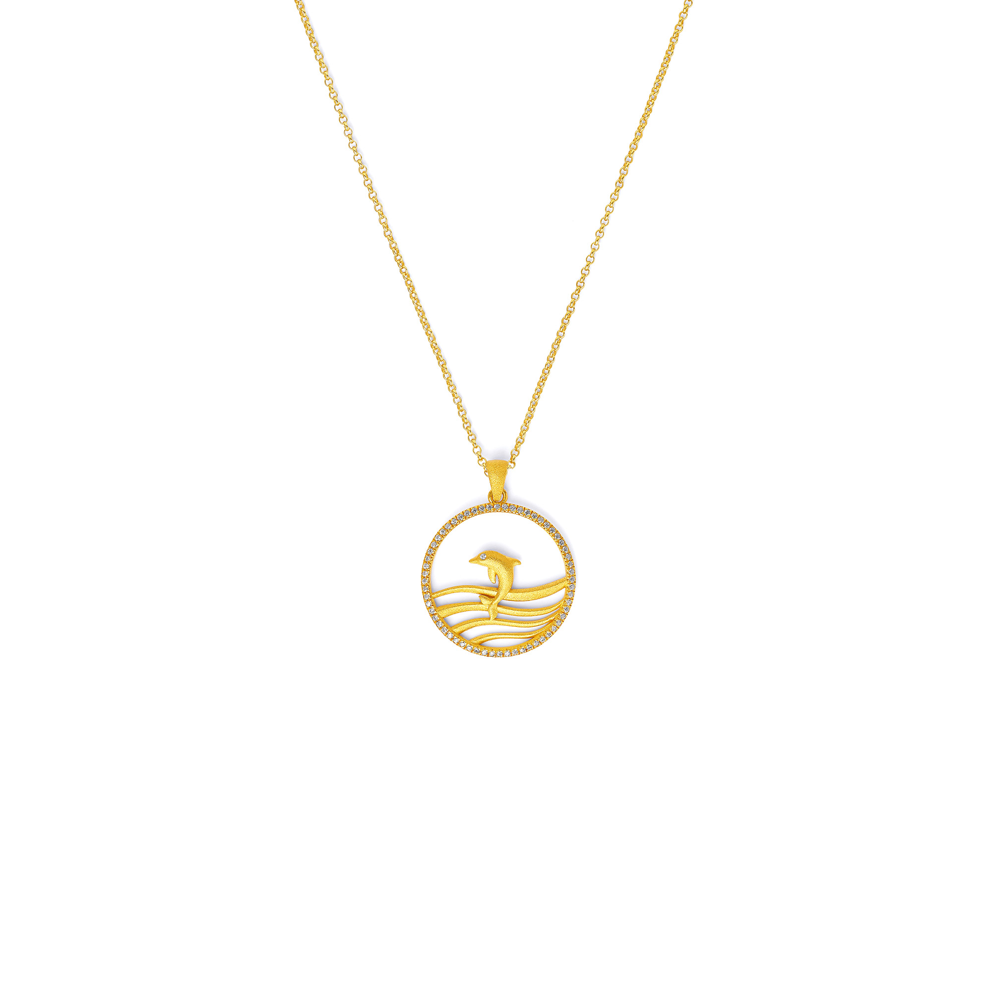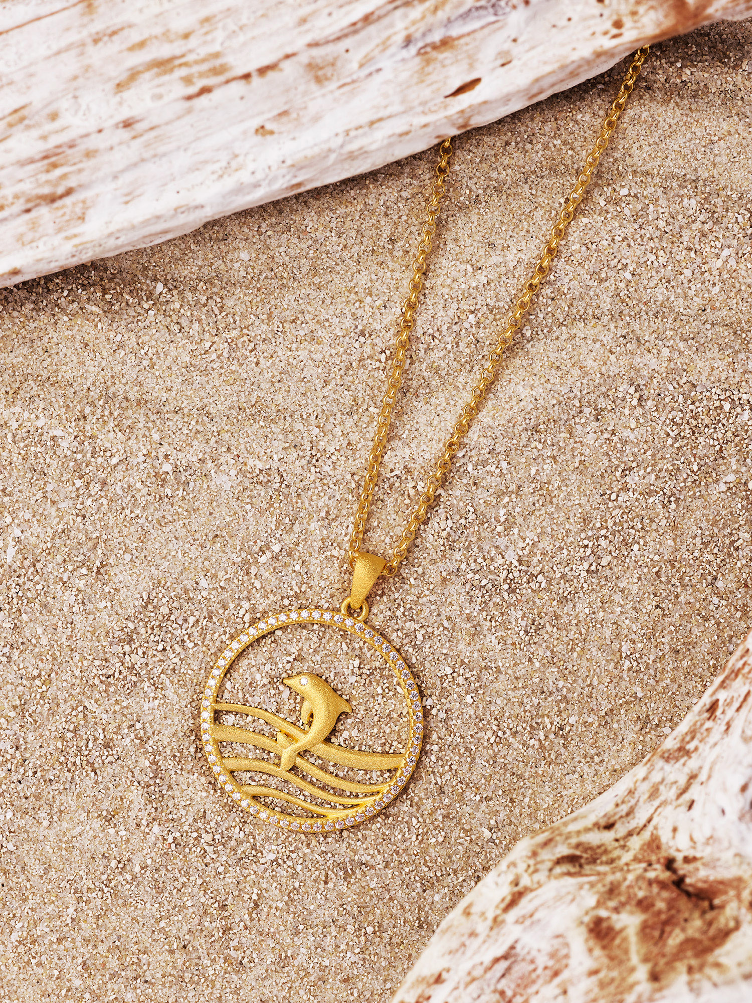 Der Delfino Anhänger hat einen maritim sportlichen Look: Innerhalb eines funkelnden Zirkoniarahmens springt ein Delfin vor vier wellenförmigen Goldbändern. Ein dynamisches Schmuckstück, dass die Begeisterung für das Meer und Delfine ausdrückt. Mit Delfinen, Seesternen und Muscheln bezaubert die neue maritime Kollektion von BERND WOLF. Vom kleinen Anhänger mit und ohne funkelndem Zirkonia bis zum großen frei schwingenden Eyecatcher bietet die Kollektion für alle LiebhaberInnen von maritimen Erlebnissen an schönen Stränden und auf See zauberhafte Schmuckstücke.