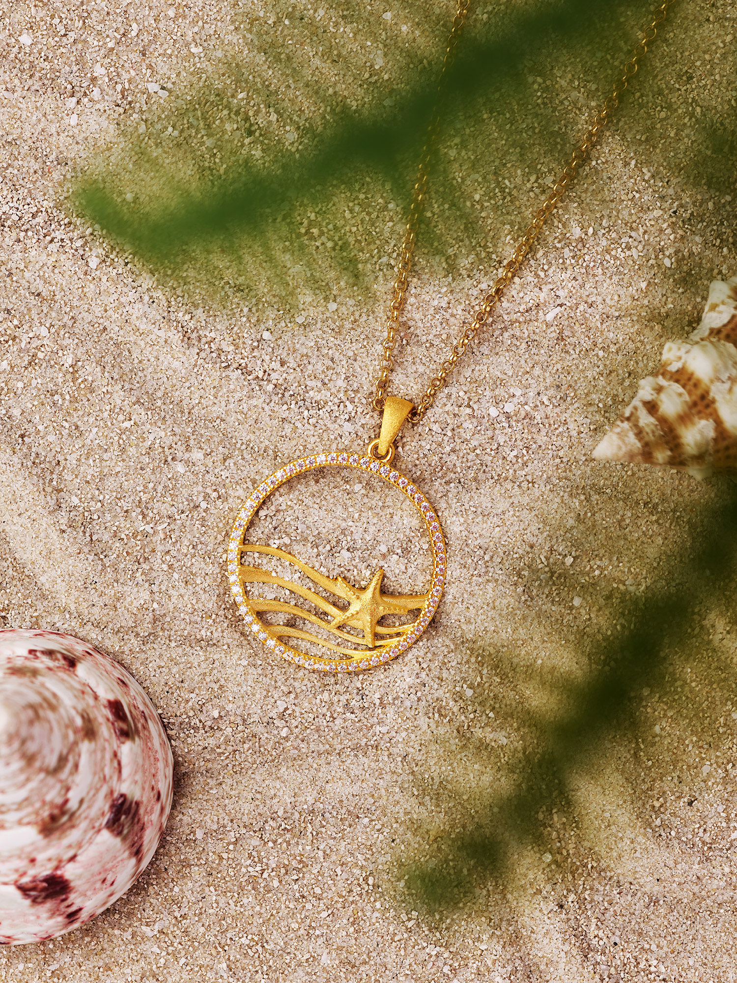 Der Seastar Anhänger hat einen maritim sportlichen Look: Innerhalb eines funkelnden Zirkoniarahmens schwebt ein Seestern vor vier wellenförmigen Goldbändern. Ein dynamisches Schmuckstück, dass die Begeisterung für das Meer und Delfine ausdrückt. Mit Delfinen, Seesternen und Muscheln bezaubert die neue maritime Kollektion von BERND WOLF. Vom kleinen Anhänger mit und ohne funkelndem Zirkonia bis zum großen frei schwingenden Eyecatcher bietet die Kollektion für alle LiebhaberInnen von maritimen Erlebnissen an schönen Stränden und auf See zauberhafte Schmuckstücke.