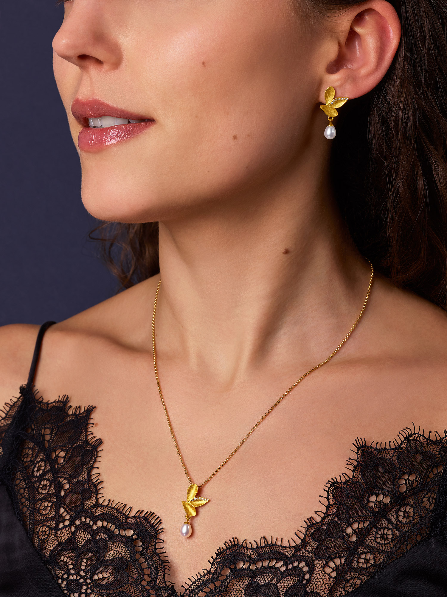 Die Ohrhänger Drena sind wahre Eyecatcher: Die elegante dreiblättrige Form aus konkarven Blättern wird durch eine Reihe funkelnder Zirkonia veredelt. Die edle tropfenförmige Süßwasserperle ergänzt das Ensemble perfekt.