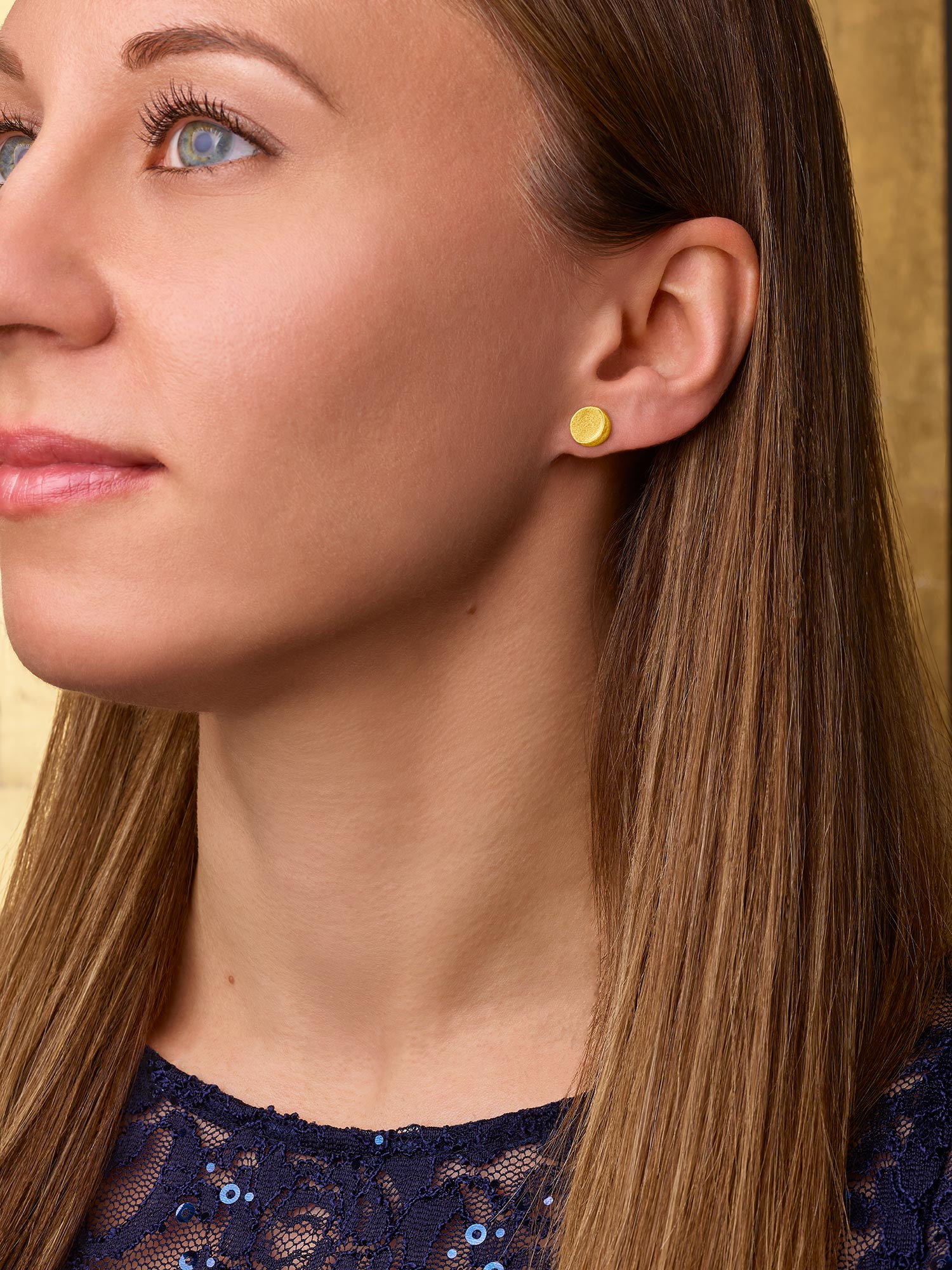 Entzückend strahlen die Ohrstecker Luni am Ohr. Der Hintergrund ist versehen mit der für BERND WOLF typischen gebürsteten Oberfläche, aus der sich der sanft geschliffene Sichelmond hervorhebt.