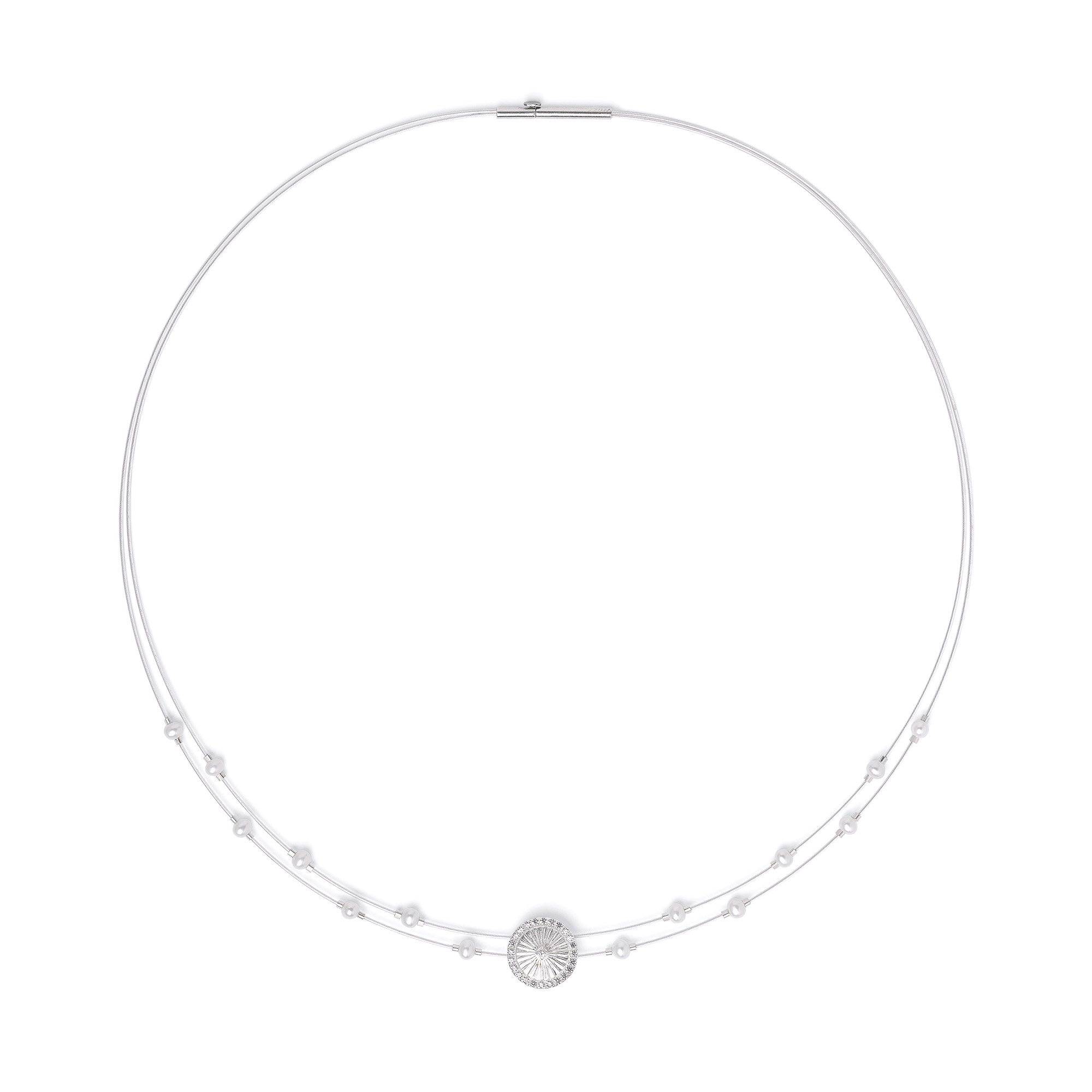 Im Zentrum des Seilcolliers Solari strahlt eine bezaubernde Sonnenscheibe, in der Mitte funkelt ein großer Zirkonia in Krappenfassung. Feine Sonnenstrahlen treffen auf einen glitzernden Ring mit Zirkonia. Auf den silbernen, hochflexiblen Seilen schweben kleine Süsswasserperlen in besonderer Qualität mit magischem Lüster. Die silbernen, ummantelten Edelstahlseile schmiegen sich mit höchstem Tragekomfort seidig an den Hals. Der bewährte BERND WOLF Tastenverschluss macht das Anlegen einfach und sicher.