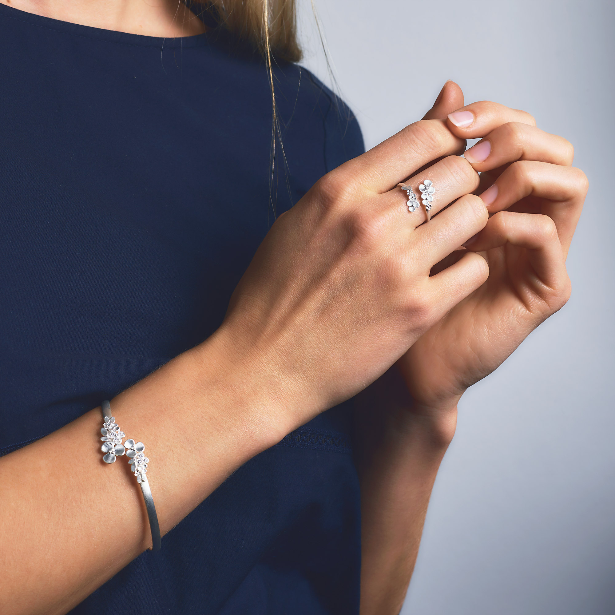 Zarte Blüten und Blätter sitzen beim Ring Fleuvette an den beiden offenen Enden. Die offene Verarbeitung ermöglicht einen hohen Tragekomfort durch schnelle Weitenanpassungen. Der Ring lässt sich mit allen Schmuckstücken der Designlinie Flowertimes kombinieren. Mit spannungsvollen, vielfältigen Blütenarrangements verzaubert die florale Designlinie „flowertimes“ von BERND WOLF. Die Designerin Yvonne Wolf hat mit den dreiblättrigen Blüten besondere, formschöne Schmuckelemente gestaltet. Mit Liebe zum Detail wurden die stilisierten Staubgefäße und Blüten gruppiert.