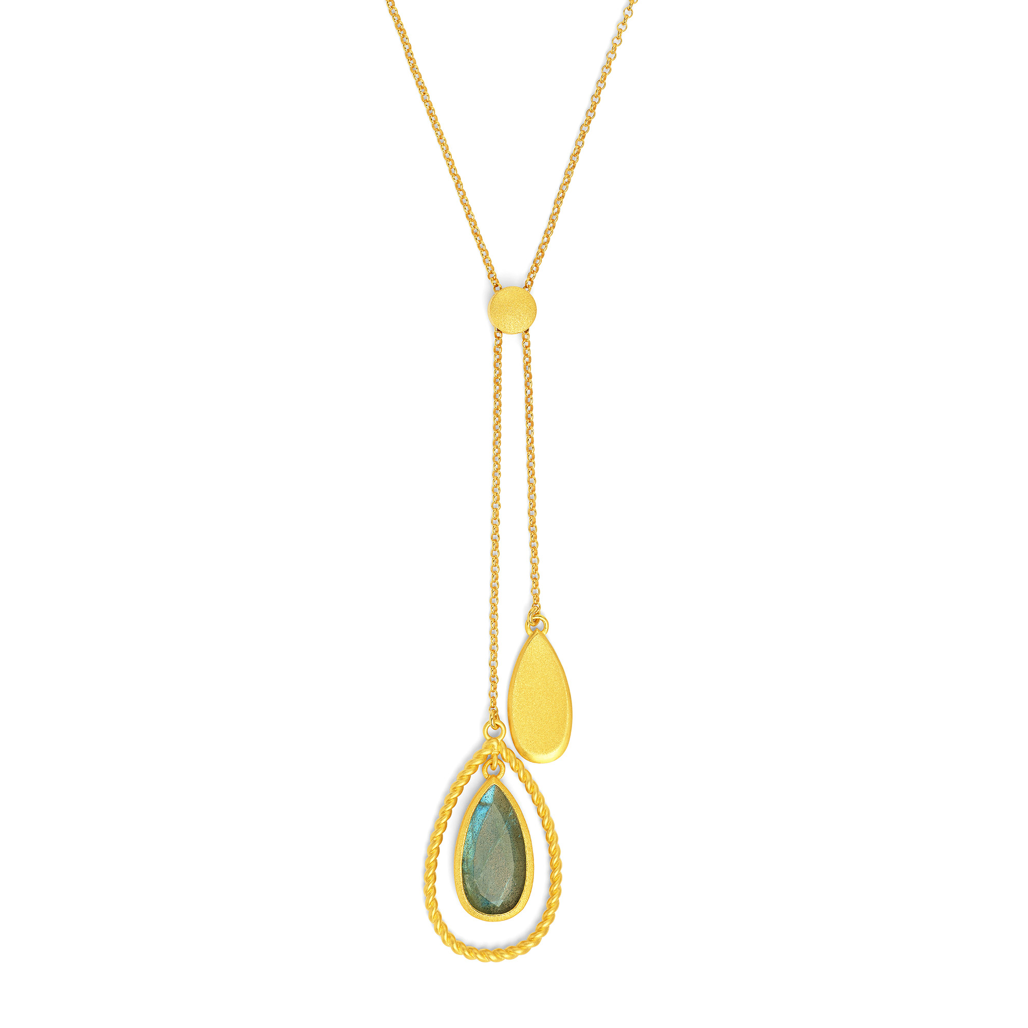 Die asymmetrische Anordnung der beiden unterschiedlichen Anhänger verleiht der Kette Florenzanna spannungsvolle Eleganz. In einem gekordelten Rahmen schwingt ein gefasster, tropfenförmig geschliffener Labradorit in besonders schöner Qualität mit einem wunderbaren, magischen Farbenspiel. Die facettierten Edelsteine blitzen mit lebendigen Reflexen in wunderbarem Kontrast und werden perfekt begleitet vom sonnig warmen Farbton der 24-Karat-Goldplattierung von BERND WOLF. Dank des verstellbaren Kettenverbinders kann das Arrangement der beiden Tropfen individuell verändert und in verschiedenen Längen getragen werden.