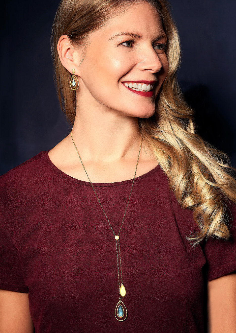 Das Schmuckset Florenzia wurde von Annalea Wolf entworfen. In einem gekordelten Rahmen schwingt ein gefasster, tropfenförmig geschliffener Labradorit in besonderes schöner Qualität mit einem wunderbaren, magischen Farbenspiel. Die Labradorittropfen werden von einer der besten Edelsteinschleifereien exklusiv für BERND WOLF passgenau geschliffen. Die facettierten Edelsteine blitzen mit lebendigen Reflexen in wunderbarem Kontrast und werden perfekt umrahmt vom sonnig warmen Farbton der 24-Karat-Goldplattierung von BERND WOLF. Ein besonderes Highlight aus der Manufaktur im Dreisamtal!