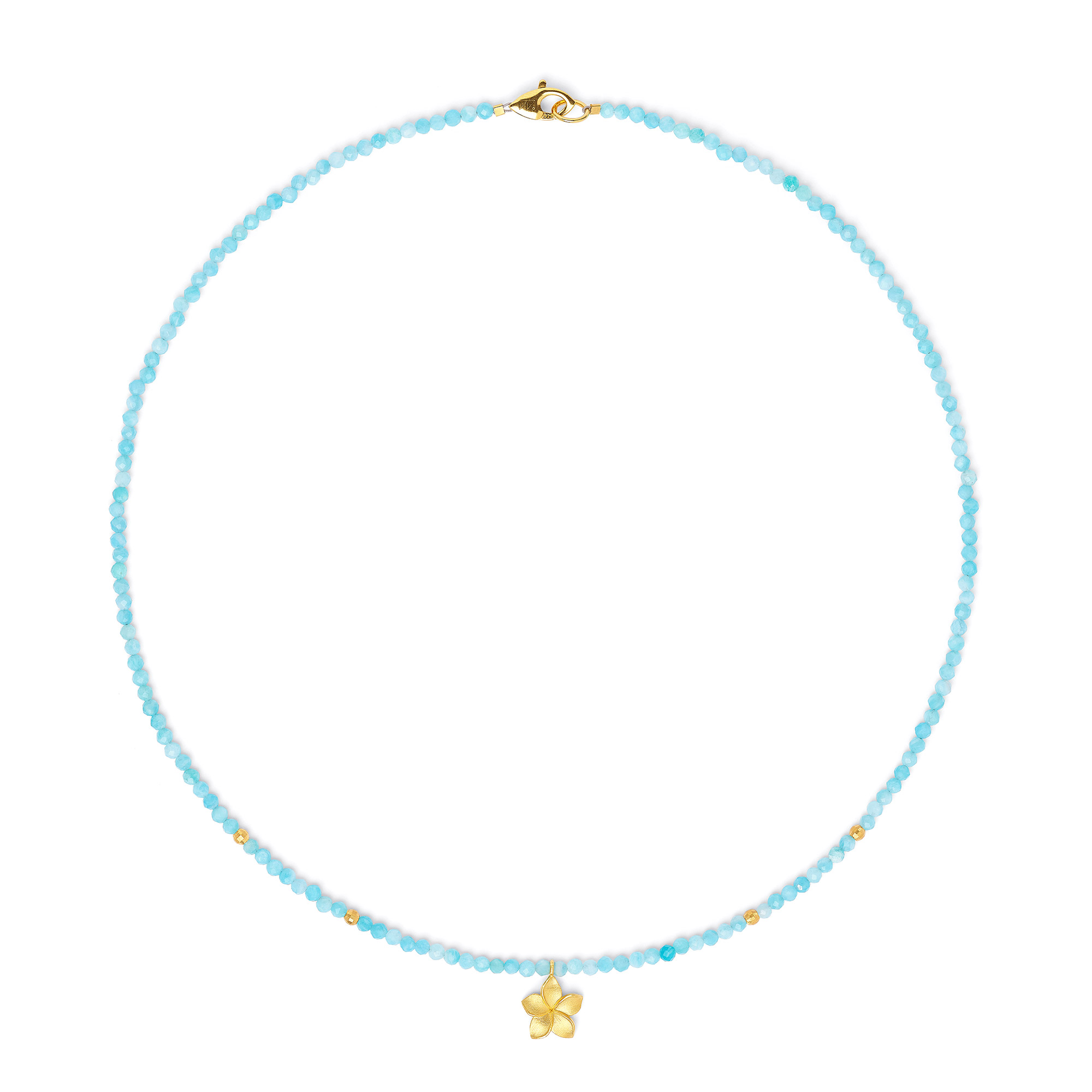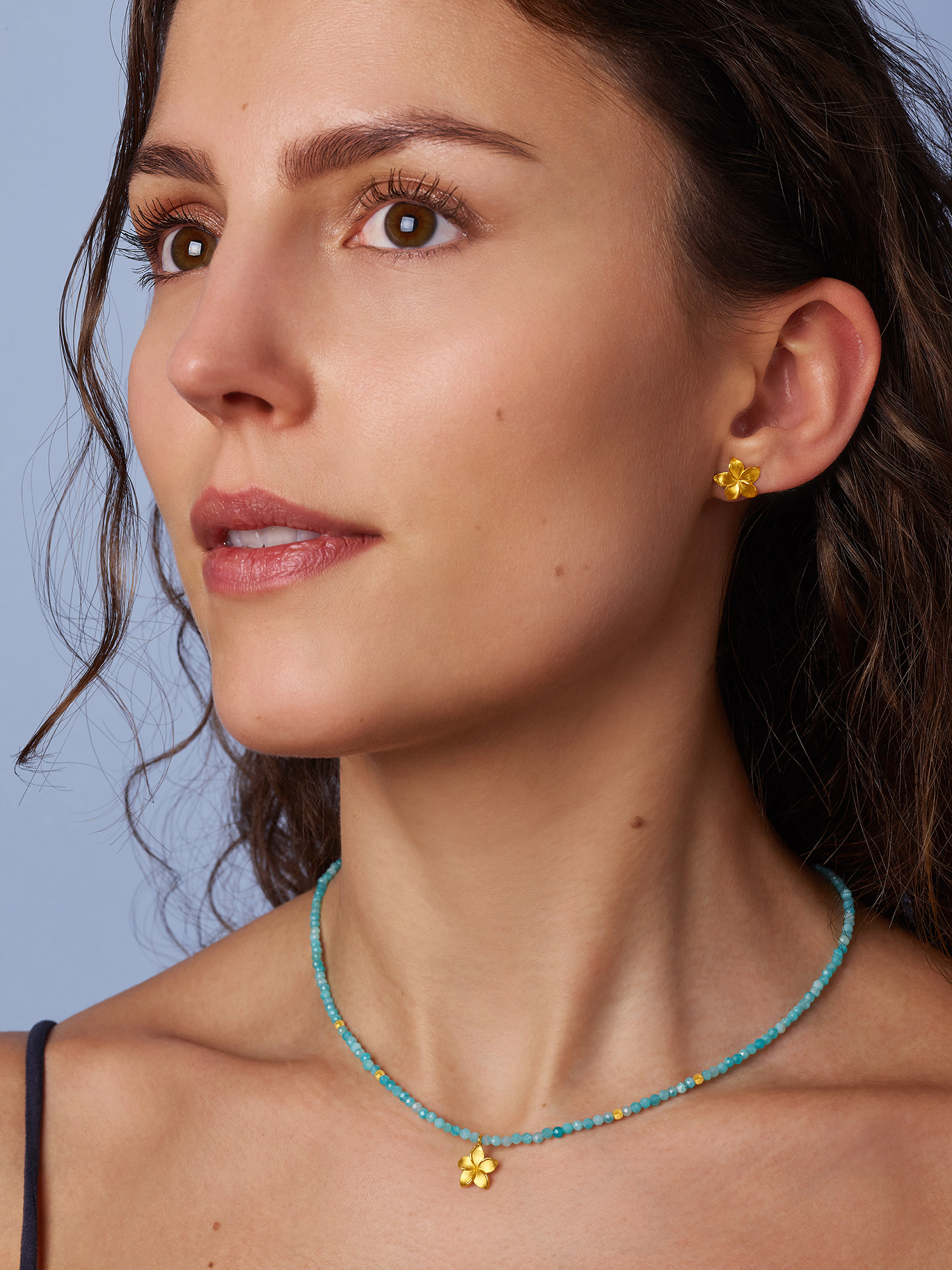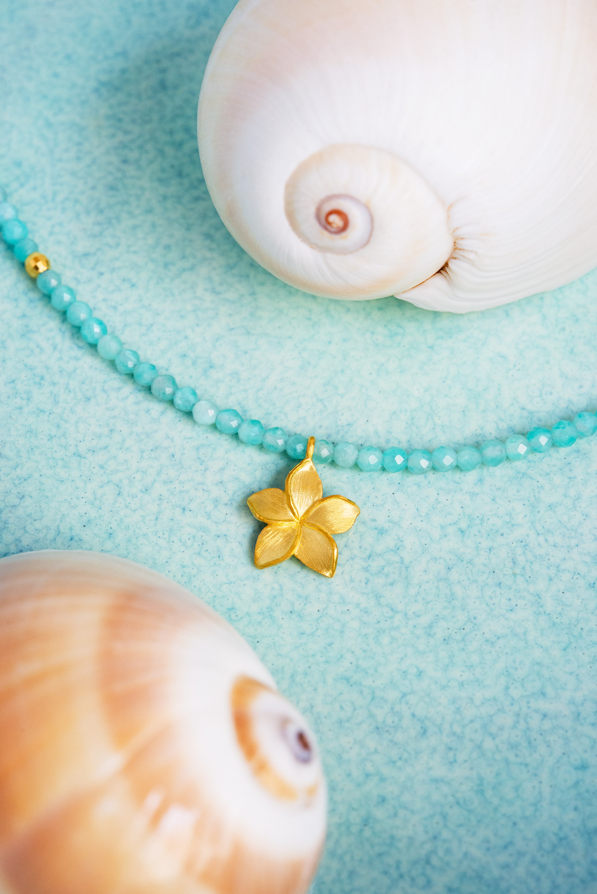 Die Halskette Franca mit karibisch blauem Amazonit entführt in eine Welt tropischer Träume. Jedes einzelne Blütenblatt wird in der BERND WOLF Manufaktur im Dreisamtal bei Freiburg von Hand mit feiner Strichmattierung versehen und im Anschluss am Rand des Blütenblatts mit einer magisch funkelnden Glanzkante verziert. Die neue Frangipani Designlinie von Annalea Wolf in 585 Gold entführt mit zauberhaften Blüten in eine Welt tropischer Träume. Jedes Blütenblatt wird sorgfältig von Hand in der BERND WOLF Manufaktur im Dreisamtal bei Freiburg mit feiner Strichmattierung und einer magisch funkelnden Glanzkante verziert. Der Clou der Aurum 585 Kollektion liegt im Kern, denn jedes Schmuckstück besteht aus massivem 18-Karat Gold und wird mit der für BERND WOLF typischen 24-Karat-Goldplattierung in Premiumqualität veredelt.