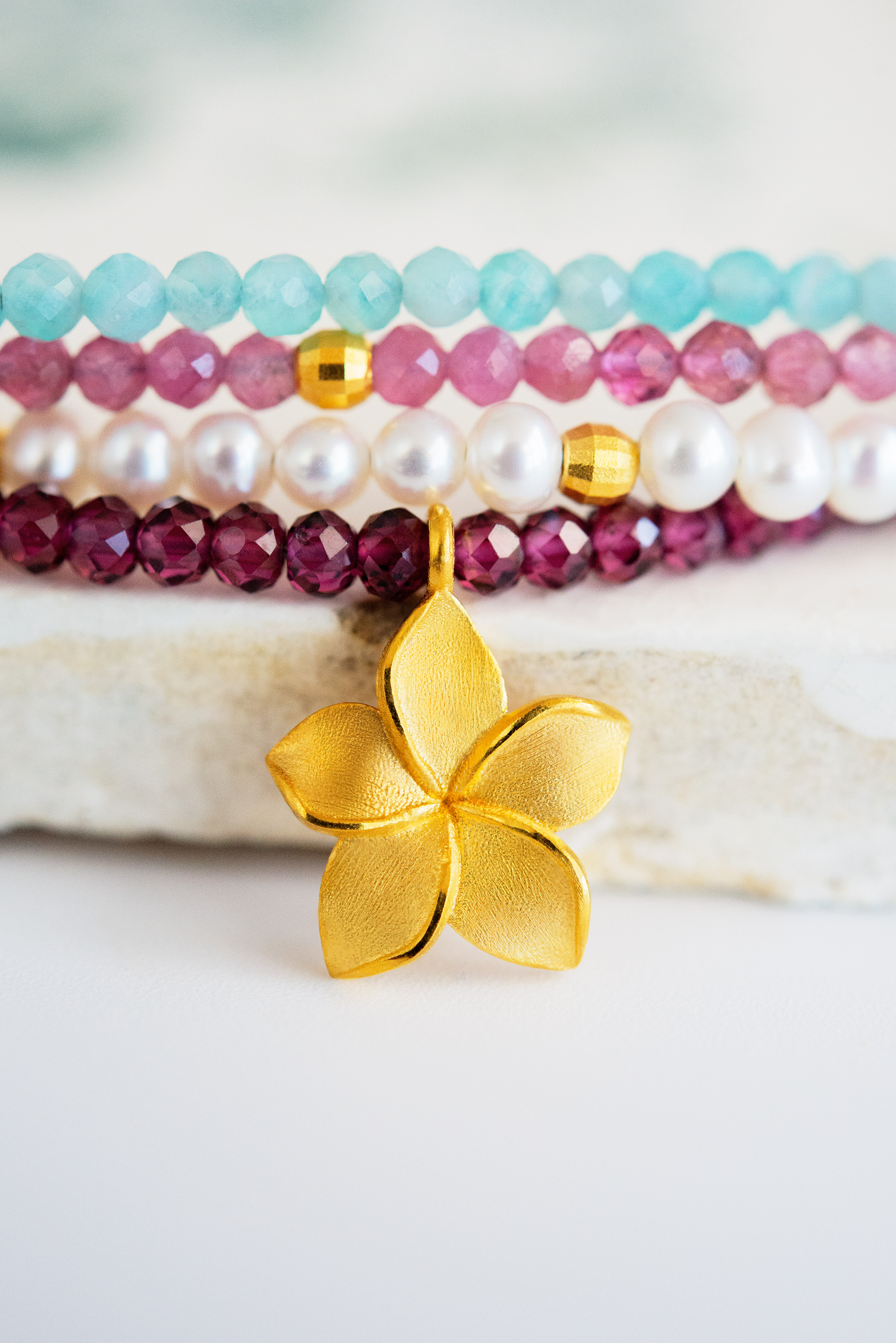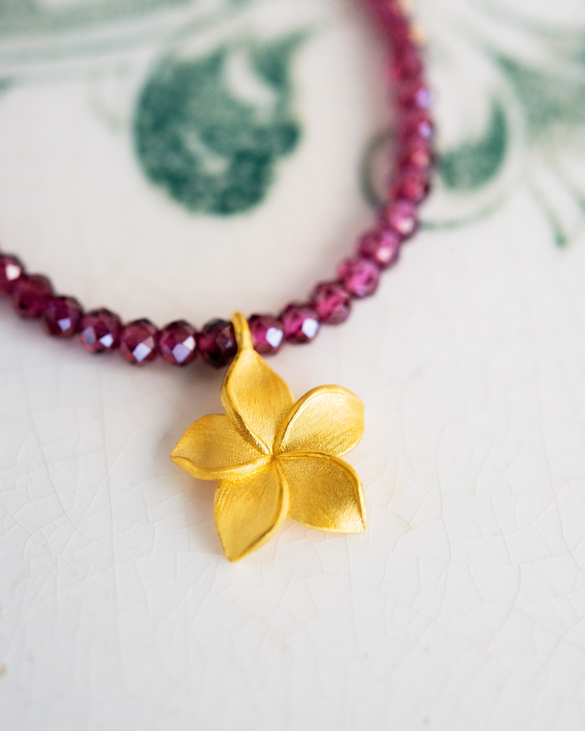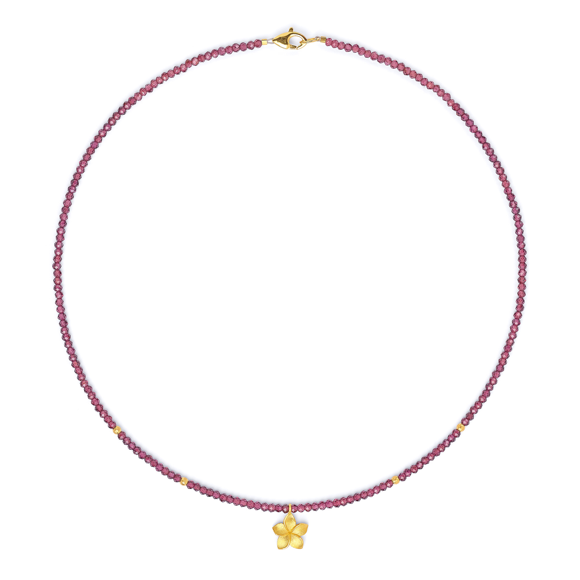 Die Halskette Franca mit geheimnisvollen Rhodolith entführt in eine Welt tropischer Träume. Jedes einzelne Blütenblatt wird in der BERND WOLF Manufaktur im Dreisamtal bei Freiburg von Hand mit feiner Strichmattierung versehen und im Anschluss am Rand des Blütenblatts mit einer magisch funkelnden Glanzkante verziert. Die neue Frangipani Designlinie von Annalea Wolf in 585 Gold entführt mit zauberhaften Blüten in eine Welt tropischer Träume. Jedes Blütenblatt wird sorgfältig von Hand in der BERND WOLF Manufaktur im Dreisamtal bei Freiburg mit feiner Strichmattierung und einer magisch funkelnden Glanzkante verziert. Der Clou der Aurum 585 Kollektion liegt im Kern, denn jedes Schmuckstück besteht aus massivem 18-Karat Gold und wird mit der für BERND WOLF typischen 24-Karat-Goldplattierung in Premiumqualität veredelt.