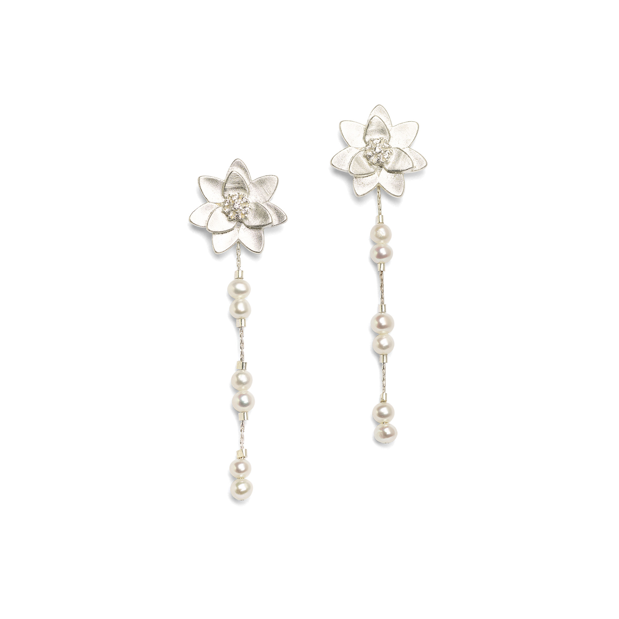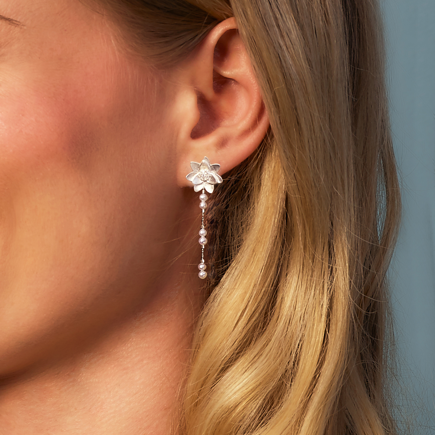 Beim Ohrschmuck Hortania wird die harmonische Blüte der Designlinie Hortensia mit auf einer zarten Kette aufgereihten, kleinen Süßwasserperlen kombiniert. Wie Tautropfen in der Morgensonne schimmern die Perlen mit ihrem sanften Lüster. Ein anmutiger Ohrschmuck - zusammen mit dem Y-Collier Hortena getragen, ein Ensemble von außergewöhnlichem Charme. Zu den imposantesten und schönsten Blüten zählt die Hortensie, die Yvonne Wolf für ihre neue Schmuckblüte interpretiert hat. Bei den Schmuckstücken der Designlinie sind die markanten, leicht angewinkelten, stilisierten Blütenblätter um einen glitzernden Blütenstempel angeordnet. Die Hortensie ist ein Symbol für Schönheit, Hingabe und Dankbarkeit.