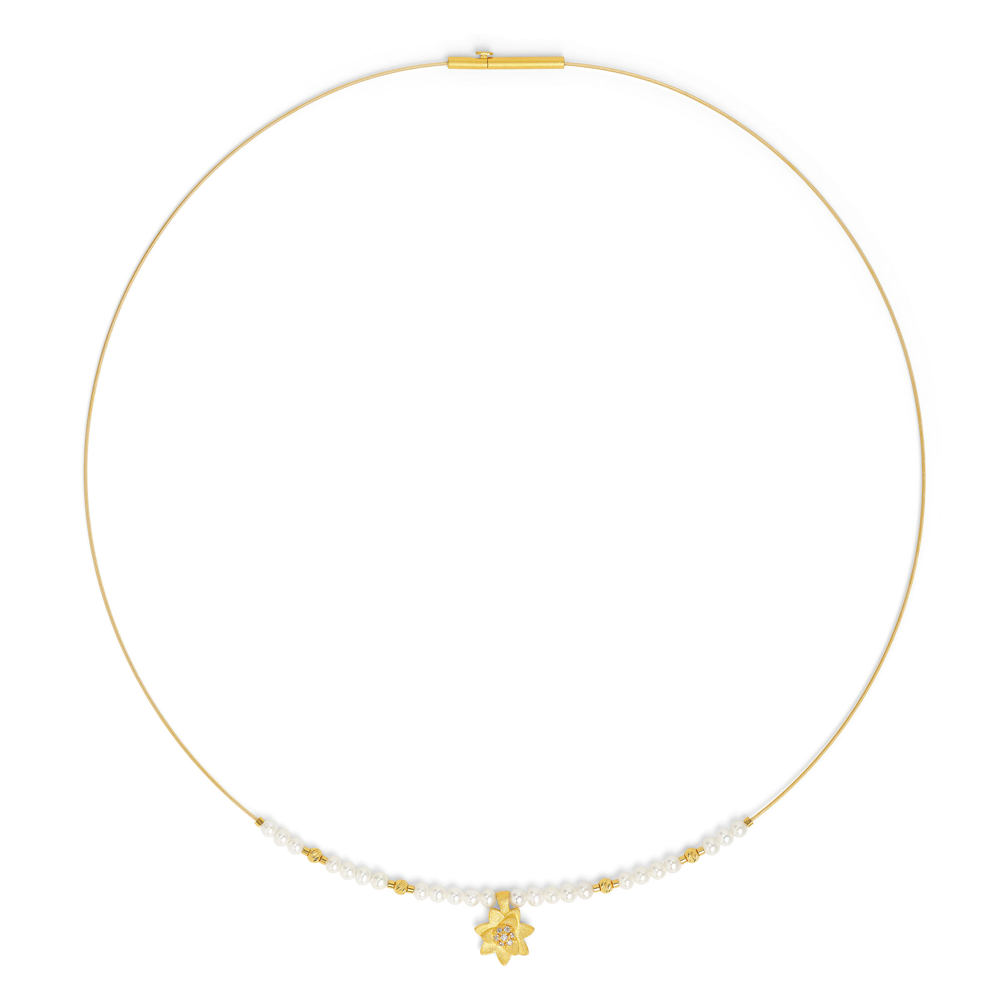 Das Seilcollier Hortenias überzeugt durch die Kombination von klarer Formensprache und verspielter Grazie. Sanft schimmernde Süßwasserperlen gefädelt auf hochflexiblem Feinseil, werden von vier Elementen mit 24-Karat-Goldplattierung in Premiumqualität unterbrochen. Die mattierte Oberfläche der kleinen Kügelchen bildet einen lebendigen Kontrast zu dem edlen Lüster der Perlen. Ohrstecker in derselben zarten Blütenform wie der Anhänger in der Mitte, zum Beispiel die Ohrstecker Hortini, ergänzen das Collier zu einem aparten floralen Set.