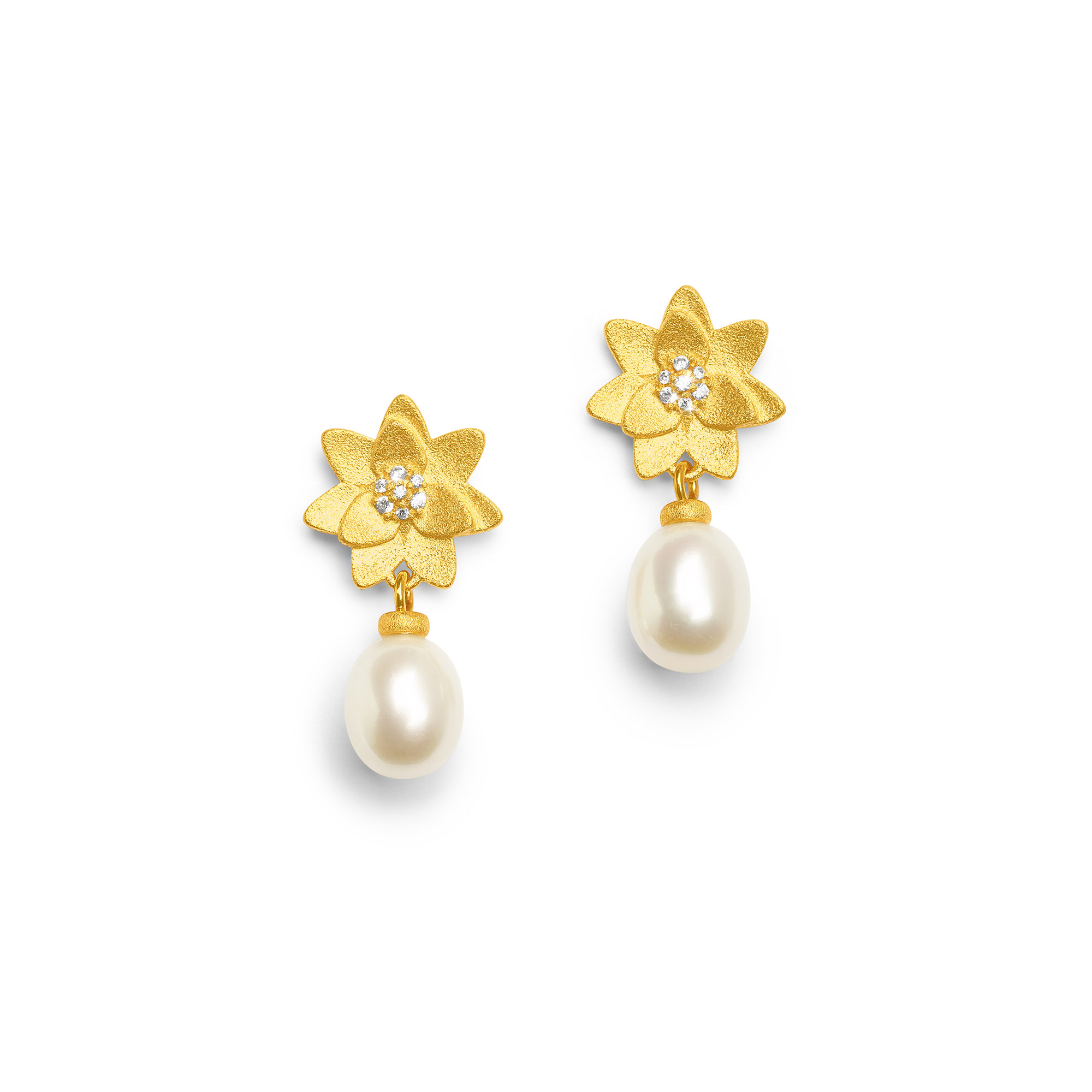 Eine Blüte und eine Perle - zwei Geschenke aus den zwei so unterschiedlichen Elementen Erde und Wasser werden duch das klare Design der Ohrhänger Hortensia zu einem harmonischen Ganzen. Der matte Glanz der sonnigen BERND WOLF Oberfläche mit der 24-Karat Goldplattierung steht in spannungsvoller Balance zum sanften Schimmer der ovalen Perle. Im Zentrum funkeln sechs aufblitzende Zirkonia in perfektem Brillantschliff. Nicht nur für besondere Gelegenheiten - außergewöhnlich und feminin. Zu den imposantesten und schönsten Blüten zählt die Hortensie, die Yvonne Wolf für ihre neue Schmuckblüte interpretiert hat. Bei den Schmuckstücken der Designlinie sind die markanten, leicht angewinkelten, stilisierten Blütenblätter um einen glitzernden Blütenstempel angeordnet. Die Hortensie ist ein Symbol für Schönheit, Hingabe und Dankbarkeit.