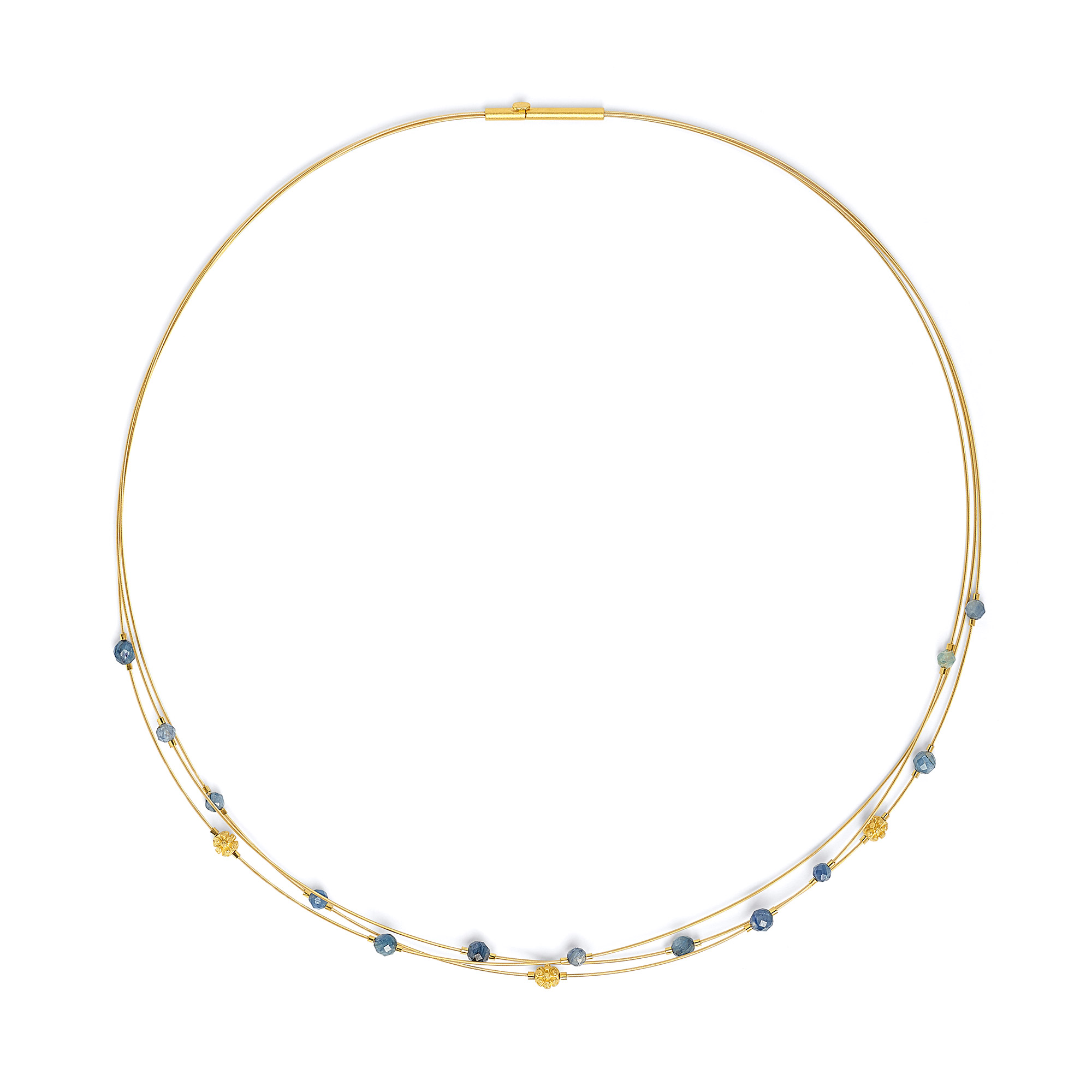 Wie schwebend sitzen beim Collier LaCiali unterschiedlich große, facettierte Kugeln aus Kyanit auf drei Feinseilen. Der Edelstein begeistert durch seine faszinierenden Blaunuancen in der Trendfarbe "Classic Blue". Die goldenen Zwischenelemente sind von der sechseckigen Form einer Bienenwabe inspiriert. Dabei erfolgt die Anordnung jedoch nicht Sechseck neben Sechseck sondern radial vom Zentrum der Mittelkugel nach außen. Dieses zarte Collier ist ein Blickfang der besonderen Art. Geprägt von Designs bei denen die Facetten der Edelsteine im Zentrum stehen begeistert die Designlinie Facette mit eindrucksvollen Statement Pieces, die alle Blicke auf sich ziehen.