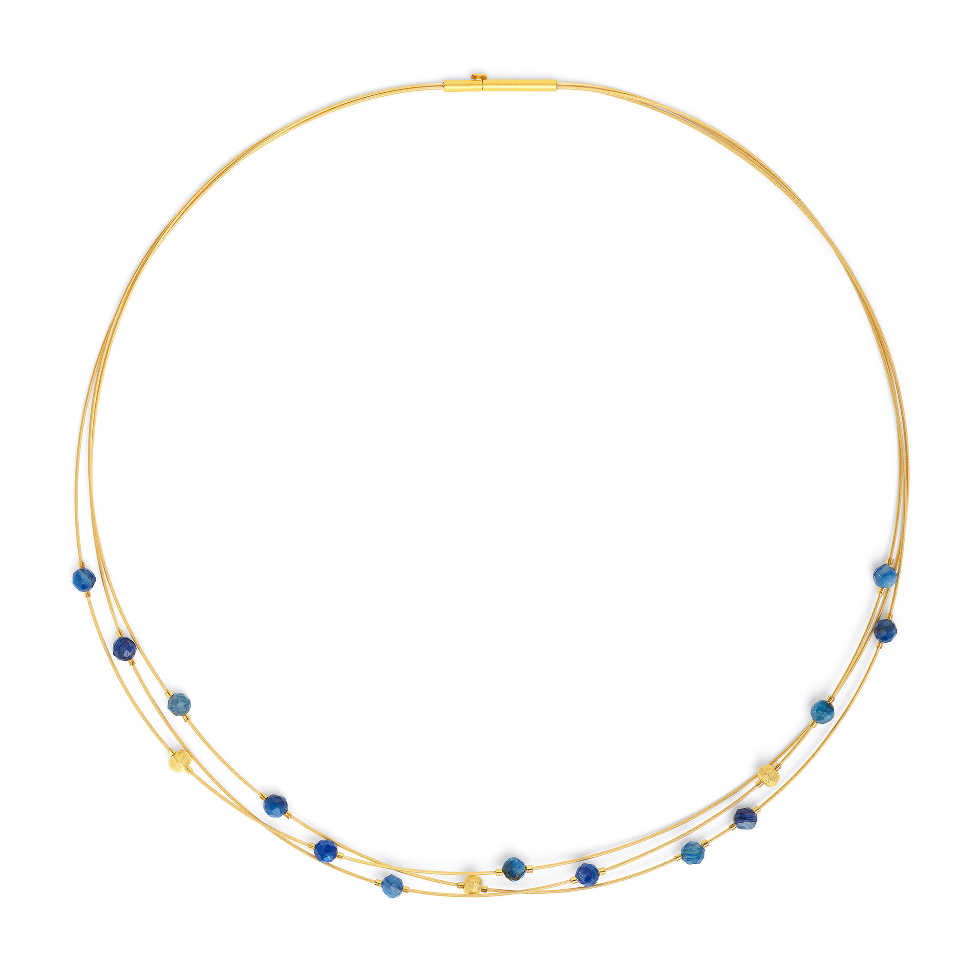 Beim Collier LaCialo werden, wie beim gleichnamigen Armreif, facettierte Kyanit Kugeln auf dem für die BERND WOLF Kollektion typischen hochflexiblen Feinseil in lockeren Abständen fixiert. Mattgebürstete Elemente, die wie kleine Lampions wirken, fügen dem Spektrum der Blautöne des ungewöhnlichen Edelsteins einen sonnig warmen Akzent hinzu. Der Tastenverschluß garantiert eine einfache Handhabung und gibt dem Reifcharakter des Halsschmucks den letzen Schliff.