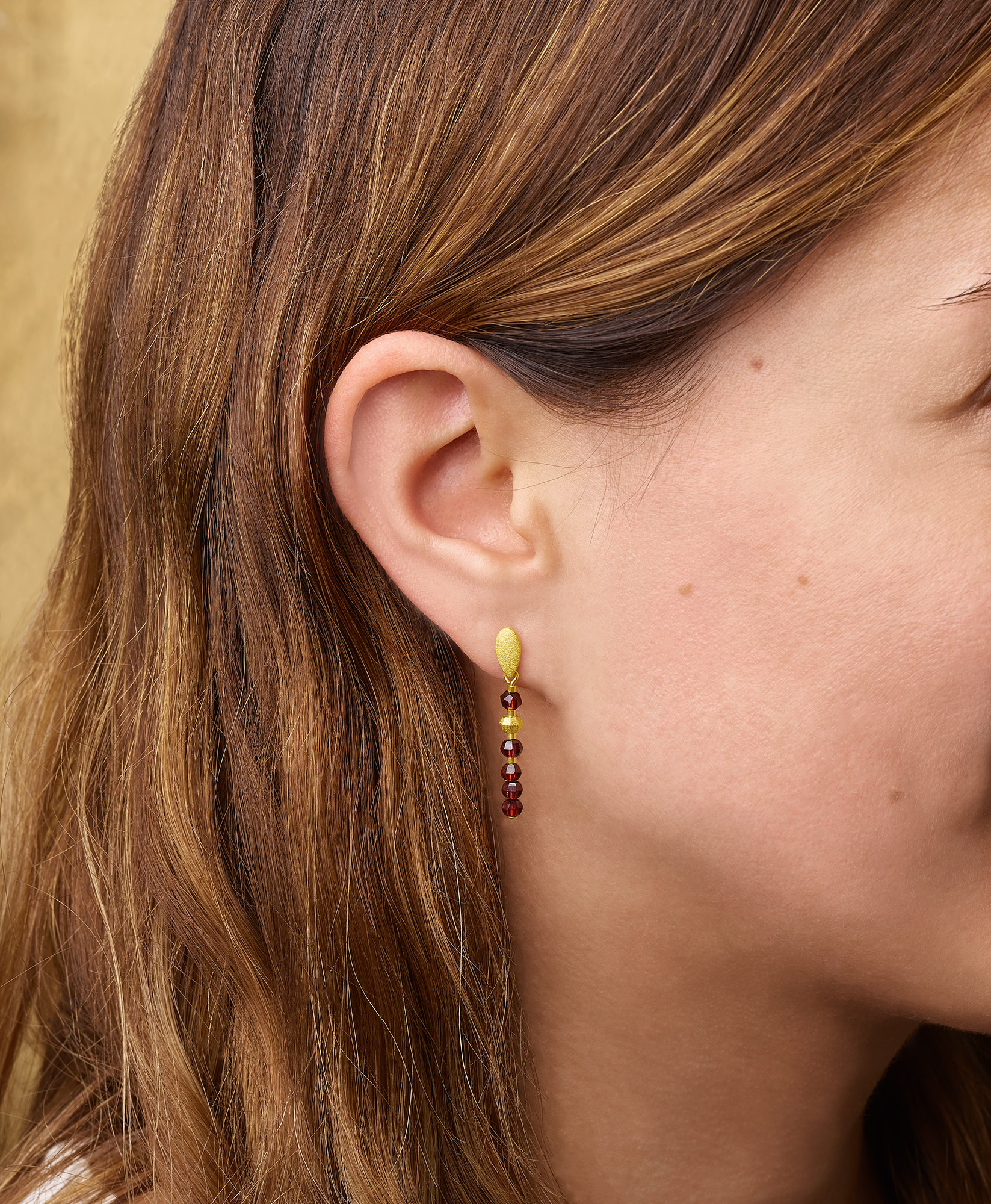 An einem tropfenförmigen, konvexen Ohrstecker mit matt gebürsteter 24-Karat Goldplattierung in Premiumqualität schwingen beim Ohrschmuck Lampa weinrot funkelnde Granate in wunderbarer Qualität. Bei dieser Art des facettierten Schliffs liegen mehrere Facetten horizontal und kantenparallel nebeneinander. Diese Form erinnert an kleine Lampions und wiederholt sich im goldenen Zwischenteil. Die gleichnamige Halskette Lampa ergänzt den außergewöhnlichen Ohrschmuck zu einem beeindruckenden Set. Die Designlinie Lampa ist inspiriert von kleinen Lampions. Die Designlinie Lampa ist inspiriert von kleinen Lampions und steht für Balance und Ausgewogenheit.