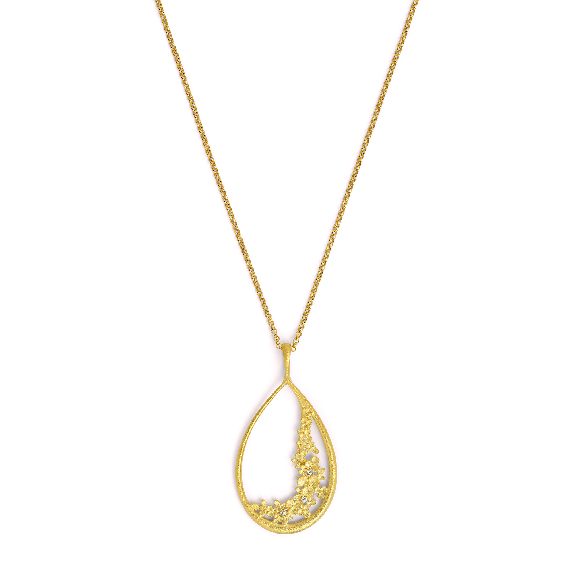 Die dreiblättrigen Blüten der Designlinie in Verbindung mit drei funkelnden Zirkoniasteinen und Blättern bilden einen spannungsvollen Bogen im offenen Tropfen des Schmucksets Liliana. Ob als großer 60mm Eye-Catcher oder als kleiner Anhänger (40mm) im Dekolleté, die zauberhafte Verspieltheit des besonderen Schmucksets, entworfen von Yvonne Wolf, ist Ausdruck von Romantik und Lebensfreude. Mit spannungsvollen, vielfältigen Blütenarrangements verzaubert die florale Designlinie „flowertimes“ von BERND WOLF. Die Designerin Yvonne Wolf hat mit den dreiblättrigen Blüten besondere, formschöne Schmuckelemente gestaltet. Mit Liebe zum Detail wurden die stilisierten Staubgefäße und Blüten gruppiert.