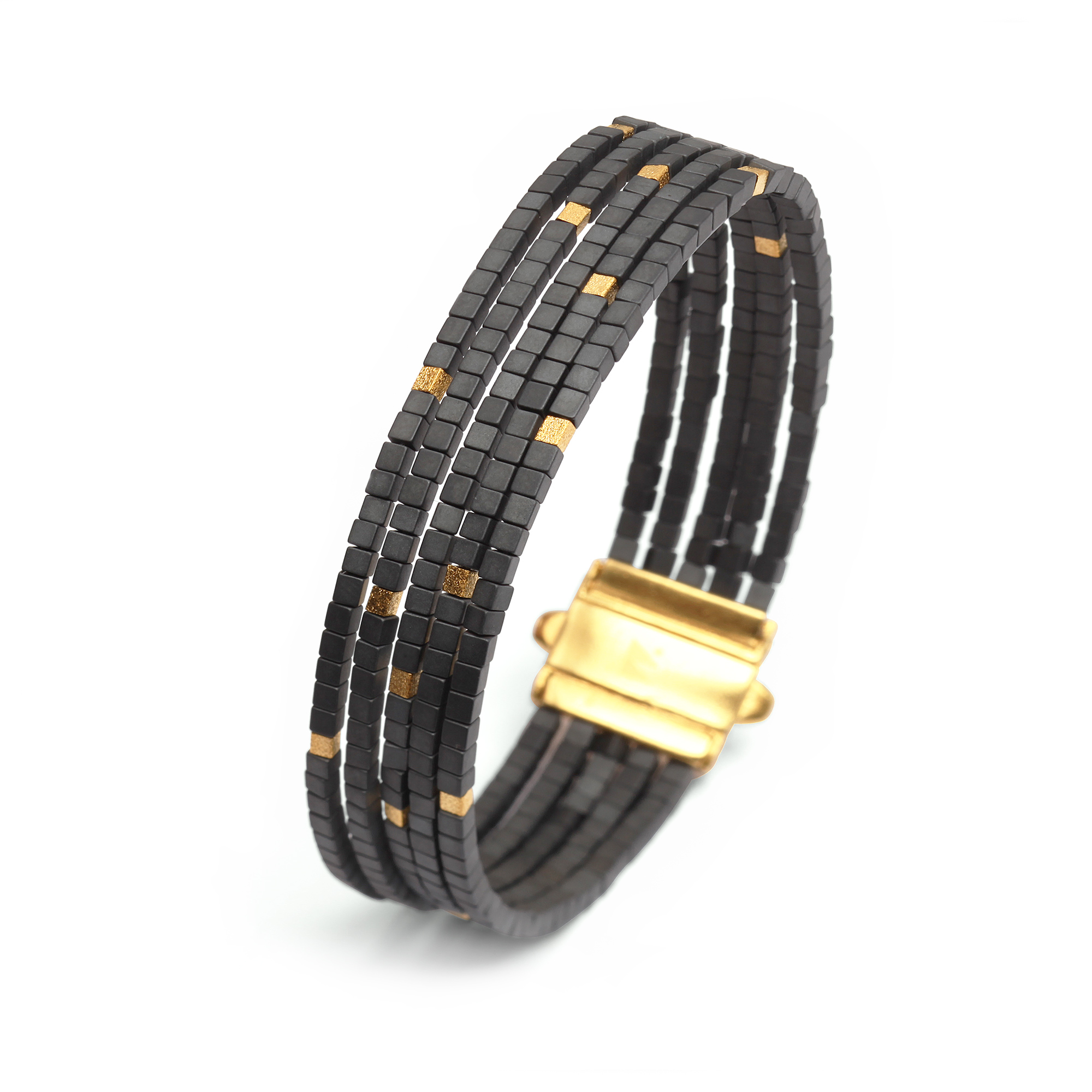 Mit seinem edlen metallischen Glanz fasziniert der elegante Hämatin. Er wird aus Eisenerz gewonnen und in einem besonderen Verfahren für BERND WOLF hergestellt. Weitere Infos zu den von BERND WOLF verwendeten Materialien im Lexikon der Edelsteine.