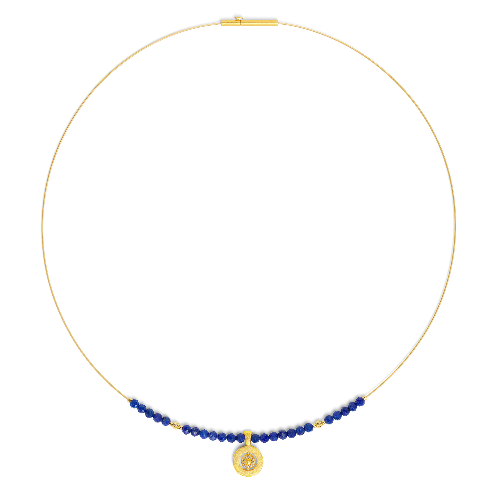 Das einreihige Collier Pirondi aus der Designlinie Pirouette überzeugt mit liebevollen Details und passt perfekt zur Designlinie Pirouette. Dieser Anhänger ist nicht drehbar. Kleine facettierte Kugeln aus dunkelblauem Lapislazuli in Topqualität wurden auf einem feinen Goldseil aufgefädelt und funkeln atemberaubend schön. Zwei zarte kleine Goldkugeln umrahmen den Anhänger, der ebenfalls aus 24-Karat Goldplattierung und mit typischer matten BERND WOLF Oberflächenstruktur hergestellt wurde. Im Zentrum des Anhängers funkeln Zirkoniasteine wie tausend Sterne am Nachthimmel. Das Collier Pirondi mit Lapislazuli kann sowohl im Alltag, aber auch zu festlichen Anlässen getragen und kombiniert werden.