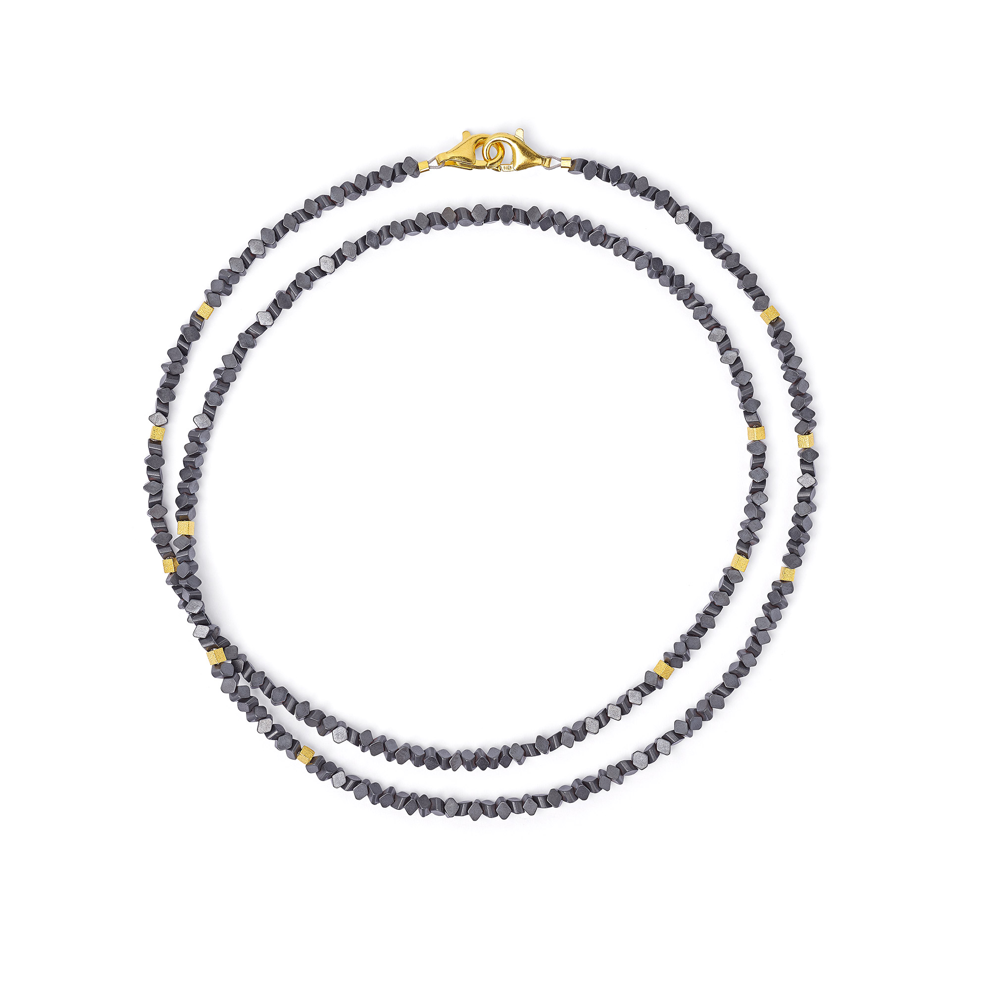 Mit seinem edlen metallischen Glanz fasziniert der elegante Hämatin. Er wird aus Eisenerz gewonnen und in einem besonderen Verfahren für BERND WOLF hergestellt. Weitere Infos zu den von BERND WOLF verwendeten Materialien im Lexikon der Edelsteine.