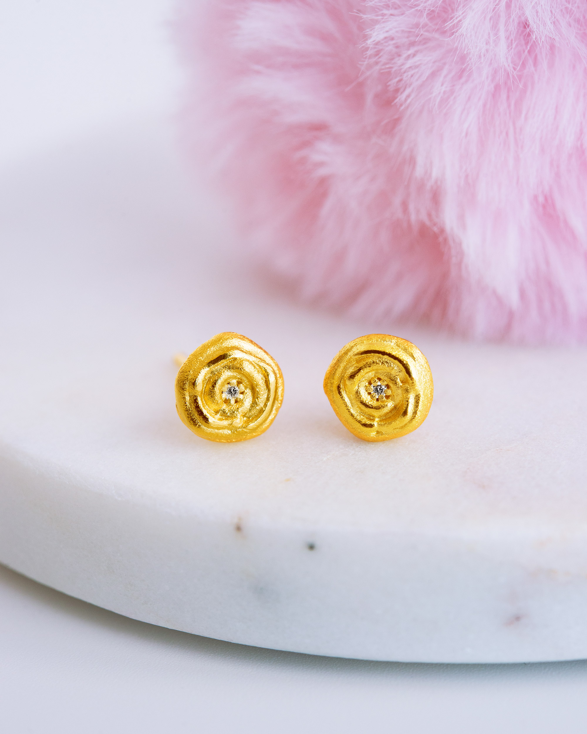 Die Ohrstecker mit 24-Karat Goldplattierung haben zarte 7 mm große Rosen mit jeweils einem funkelnden Diamanten in der Mitte. Florale Meisterwerke entfalten sich in der Rosenkollektion von Yvonne Wolf, der Designerin und Ehefrau von Bernd Wolf. Inspiriert von der Ehre, eine Rose von dem international erfolgreichen englischen Rosenzüchter John Scarman gewidmet zu bekommen, präsentiert Yvonne Wolf ihre einzigartige Schmuckkollektion.
