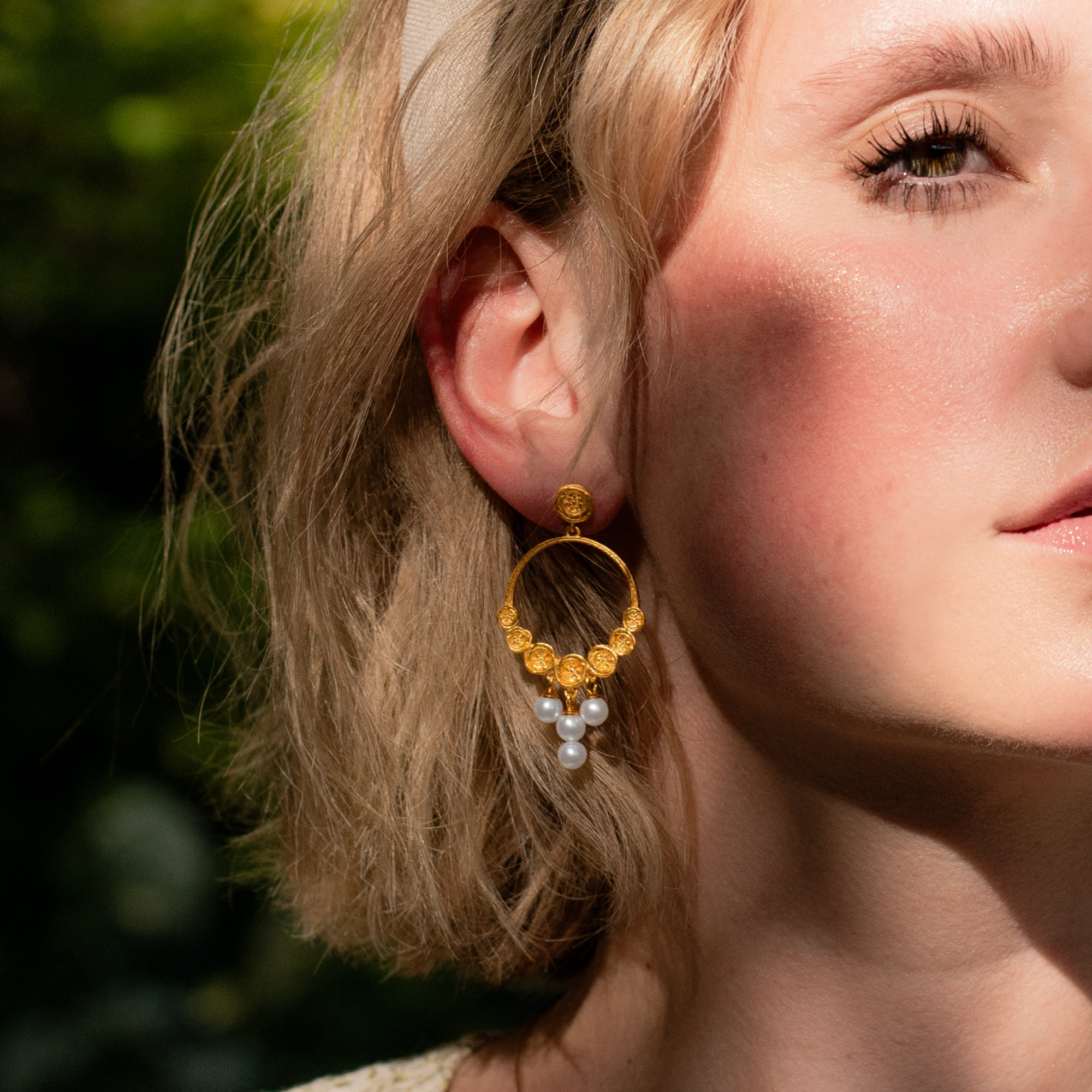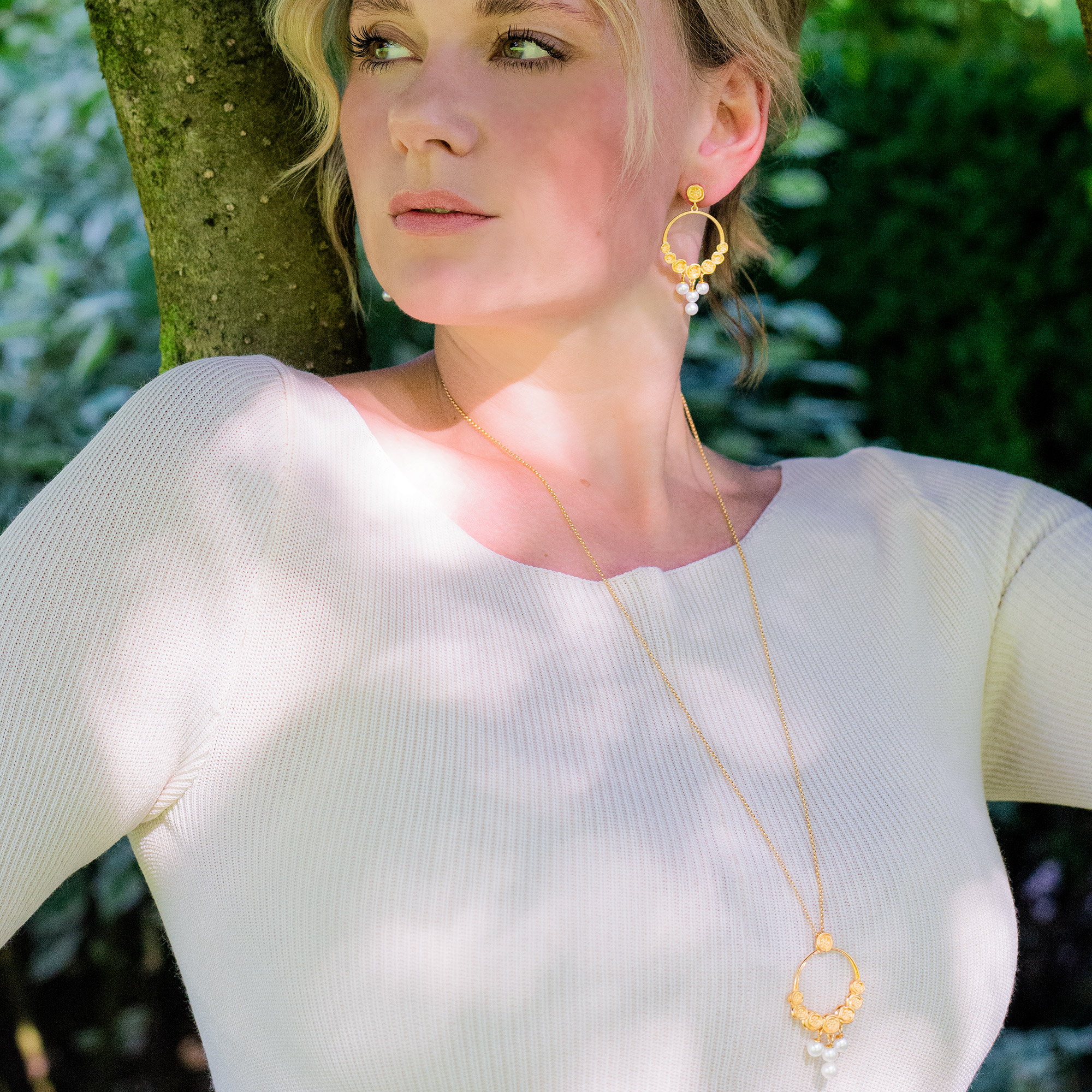 Die zauberhaften Ohrhänger werden durch filigrane Rosen mit 24-Karat Goldplattierung und jeweils drei Süßwasserperlen abgerundet. Florale Meisterwerke entfalten sich in der Rosenkollektion von Yvonne Wolf, der Designerin und Ehefrau von Bernd Wolf. Inspiriert von der Ehre, eine Rose von dem international erfolgreichen englischen Rosenzüchter John Scarman gewidmet zu bekommen, präsentiert Yvonne Wolf ihre einzigartige Schmuckkollektion.