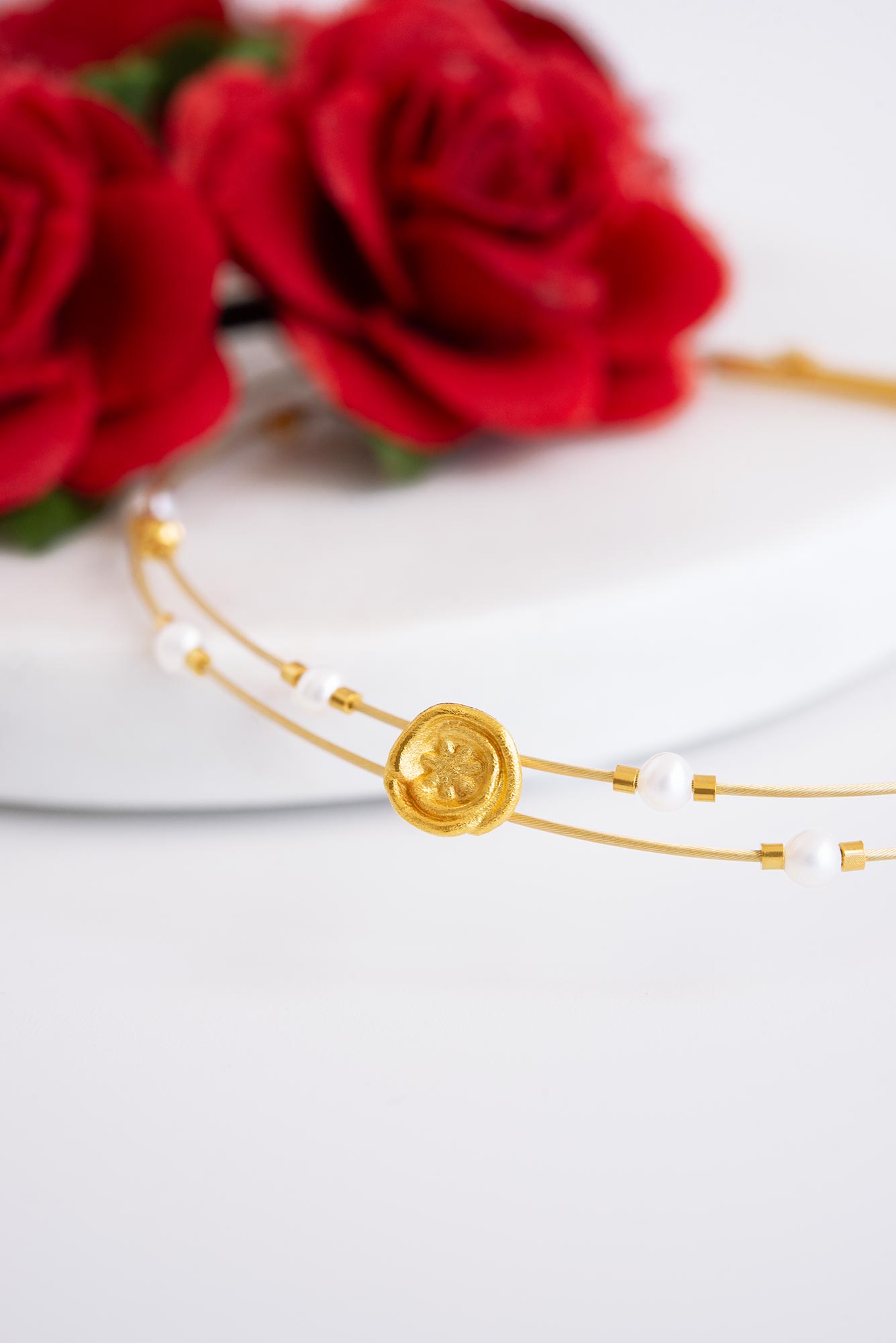 Der Armreif Roselis verzaubert mit seinem eleganten Design. Auf zwei Edelstahlseilen schweben Süßwasserperlen und geriffelte Goldkugeln. Als Mittelteil verbindet eine natürlich geformte Rosenblüte die beiden Seile. Florale Meisterwerke entfalten sich in der Rosenkollektion von Yvonne Wolf, der Designerin und Ehefrau von Bernd Wolf. Inspiriert von der Ehre, eine Rose von dem international erfolgreichen englischen Rosenzüchter John Scarman gewidmet zu bekommen, präsentiert Yvonne Wolf ihre einzigartige Schmuckkollektion.