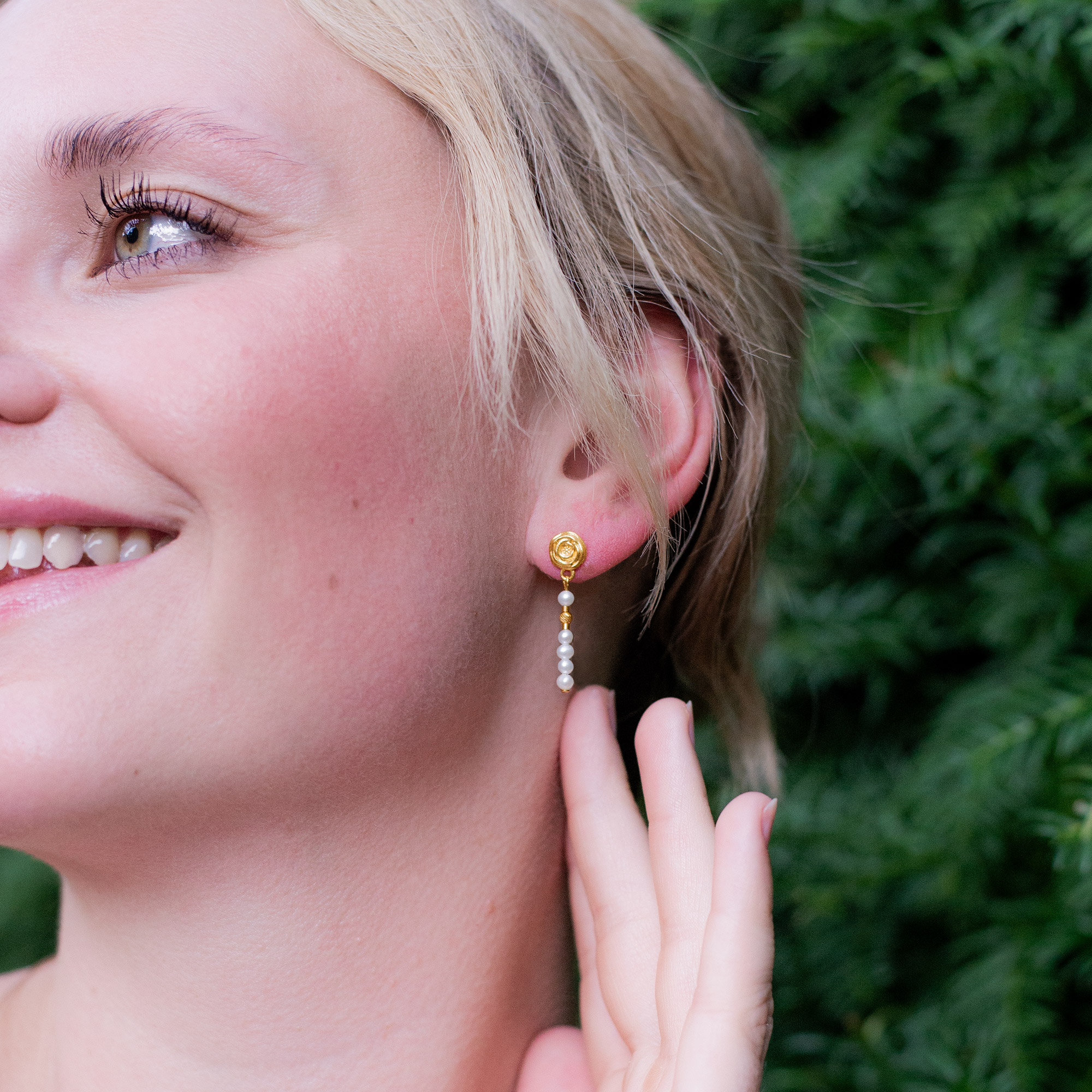Diese Rosen Ohrhänger werden mit kleinen zauberhaften Süßwasserperlen und vergoldeten 925er Sterlingsilber Kugeln abgerundet. Florale Meisterwerke entfalten sich in der Rosenkollektion von Yvonne Wolf, der Designerin und Ehefrau von Bernd Wolf. Inspiriert von der Ehre, eine Rose von dem international erfolgreichen englischen Rosenzüchter John Scarman gewidmet zu bekommen, präsentiert Yvonne Wolf ihre einzigartige Schmuckkollektion.
