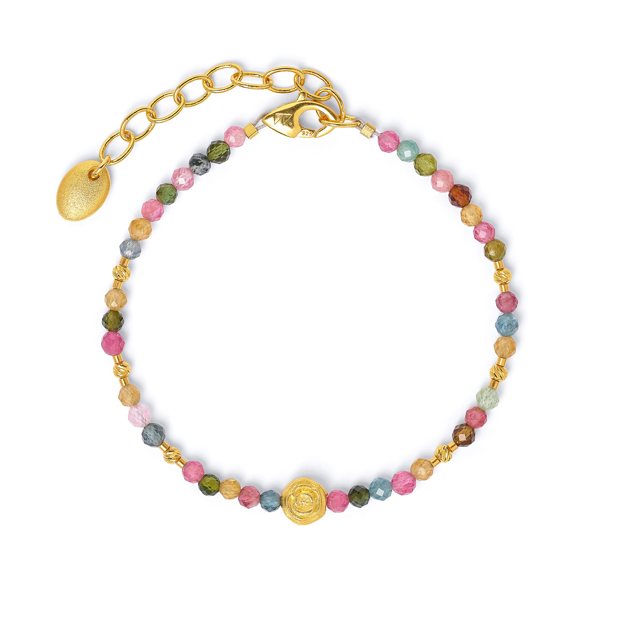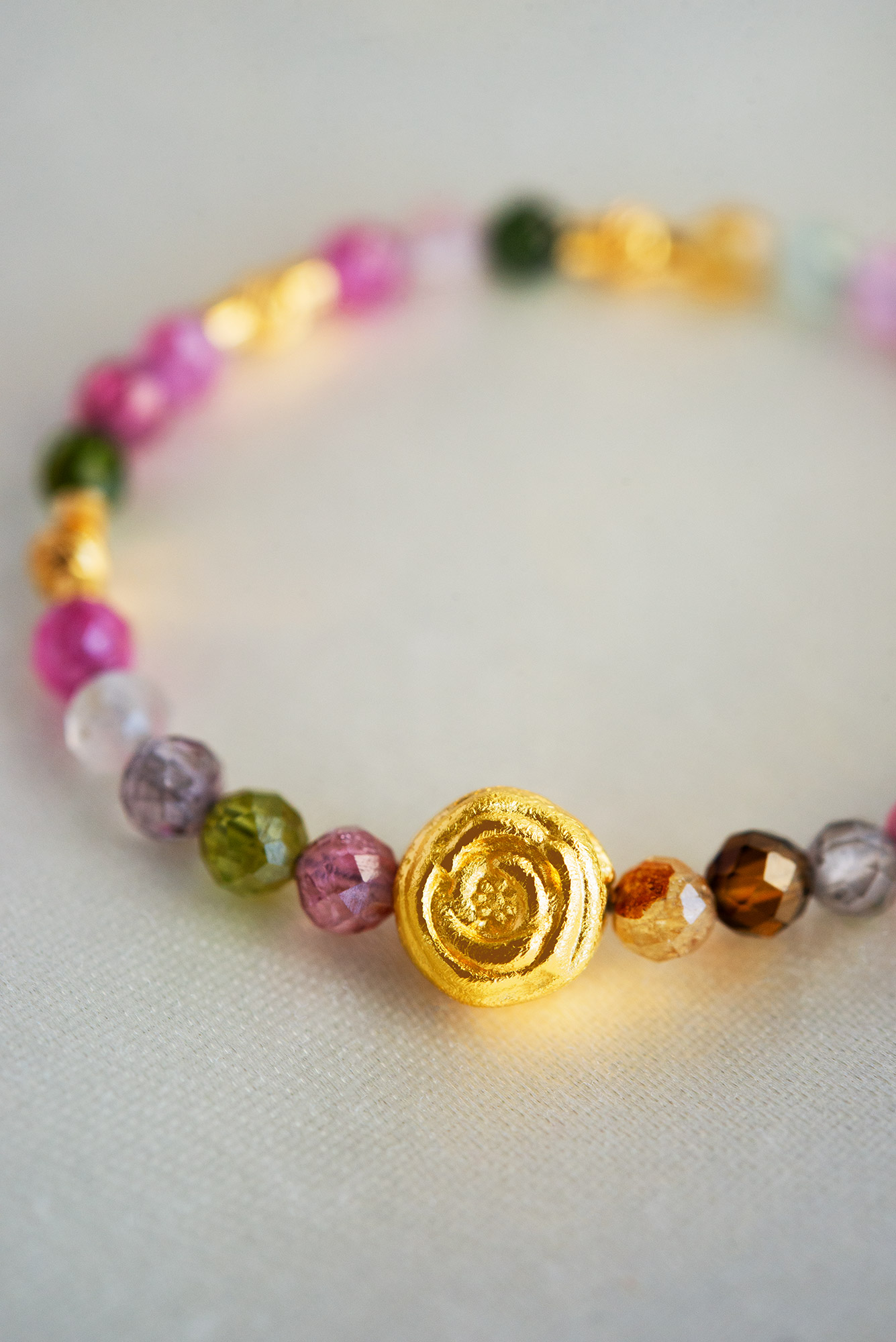 Die Armkette Rosemarie überzeugt durch natürliche Leichtigkeit: Turmalin in allen Farben, glänzende Goldröhrchen, geriffelte Kugelelemente und eine schön geformte Rose mit matter 24-Karat Goldplattierung als Mittelteil. Florale Meisterwerke entfalten sich in der Rosenkollektion von Yvonne Wolf, der Designerin und Ehefrau von Bernd Wolf. Inspiriert von der Ehre, eine Rose von dem international erfolgreichen englischen Rosenzüchter John Scarman gewidmet zu bekommen, präsentiert Yvonne Wolf ihre einzigartige Schmuckkollektion.