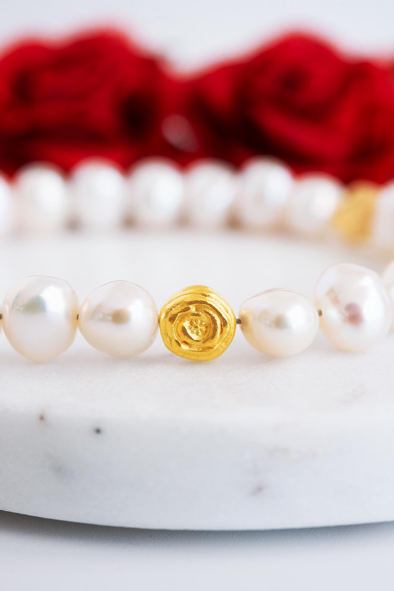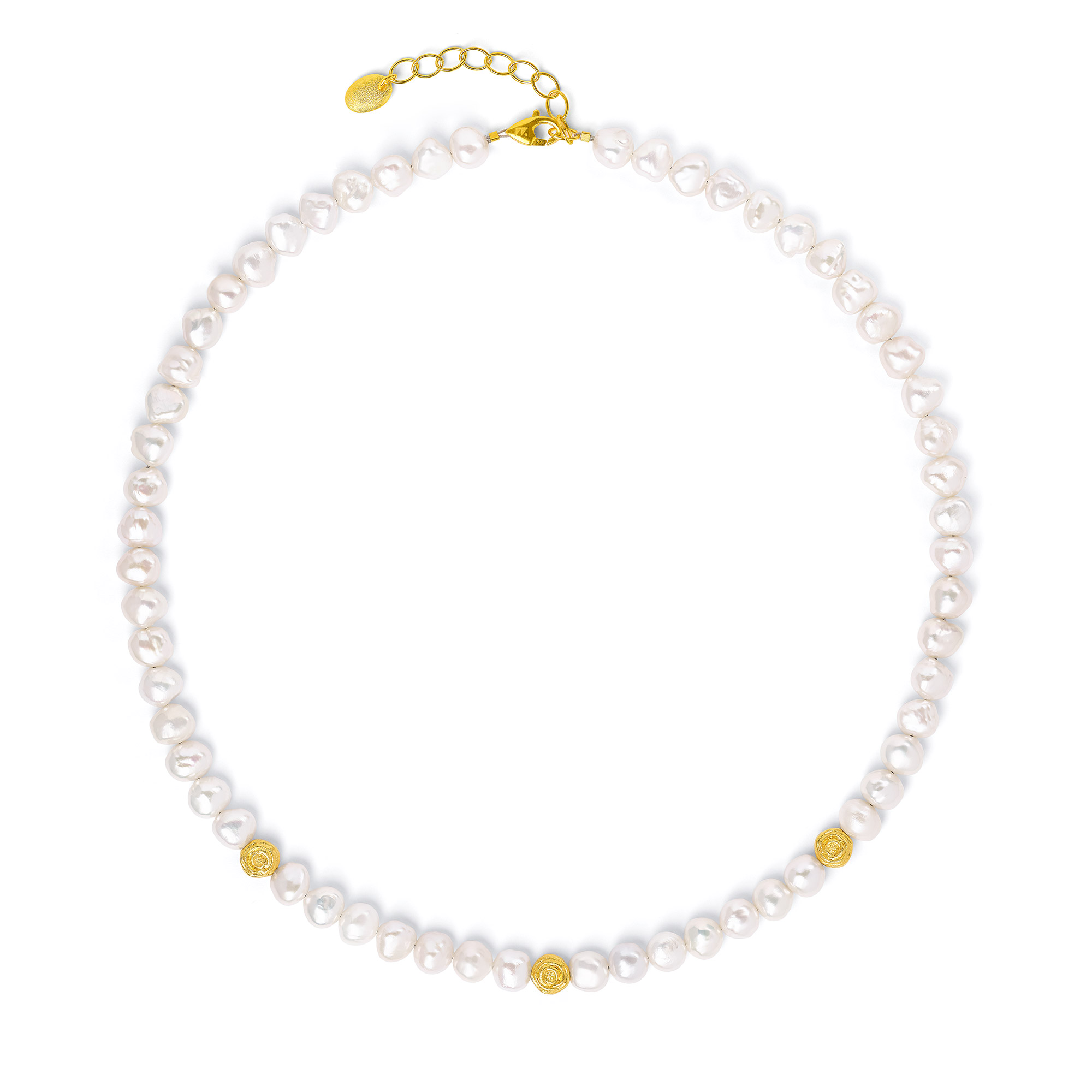 Die mit Süßwasserperlen besetzte Halskette wird durch kleine Rosen mit sonniger 24-Karat Goldplattierung ergänzt. Florale Meisterwerke entfalten sich in der Rosenkollektion von Yvonne Wolf, der Designerin und Ehefrau von Bernd Wolf. Inspiriert von der Ehre, eine Rose von dem international erfolgreichen englischen Rosenzüchter John Scarman gewidmet zu bekommen, präsentiert Yvonne Wolf ihre einzigartige Schmuckkollektion.
