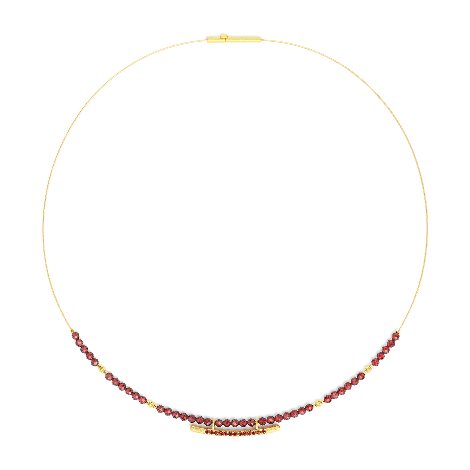Der Halsschmuck SenSen hat einen zauberhaften, fernöstlichen Touch. Auf dem sanft gebogenen Stab, der unterhalb der magischen roten Granatkugeln mit funklenden Facetten schwebt, glitzern dicht gefasste Granate in Brillantschliff. Sie werden umrahmt von der mattgebürsteten Oberfläche im sonnig warmen Farbton der BERND WOLF 24-Karat-Goldplattierung in Premiumqualität und geben dem Collier eine ganz besondere, elegante und edle Ausstrahlung.