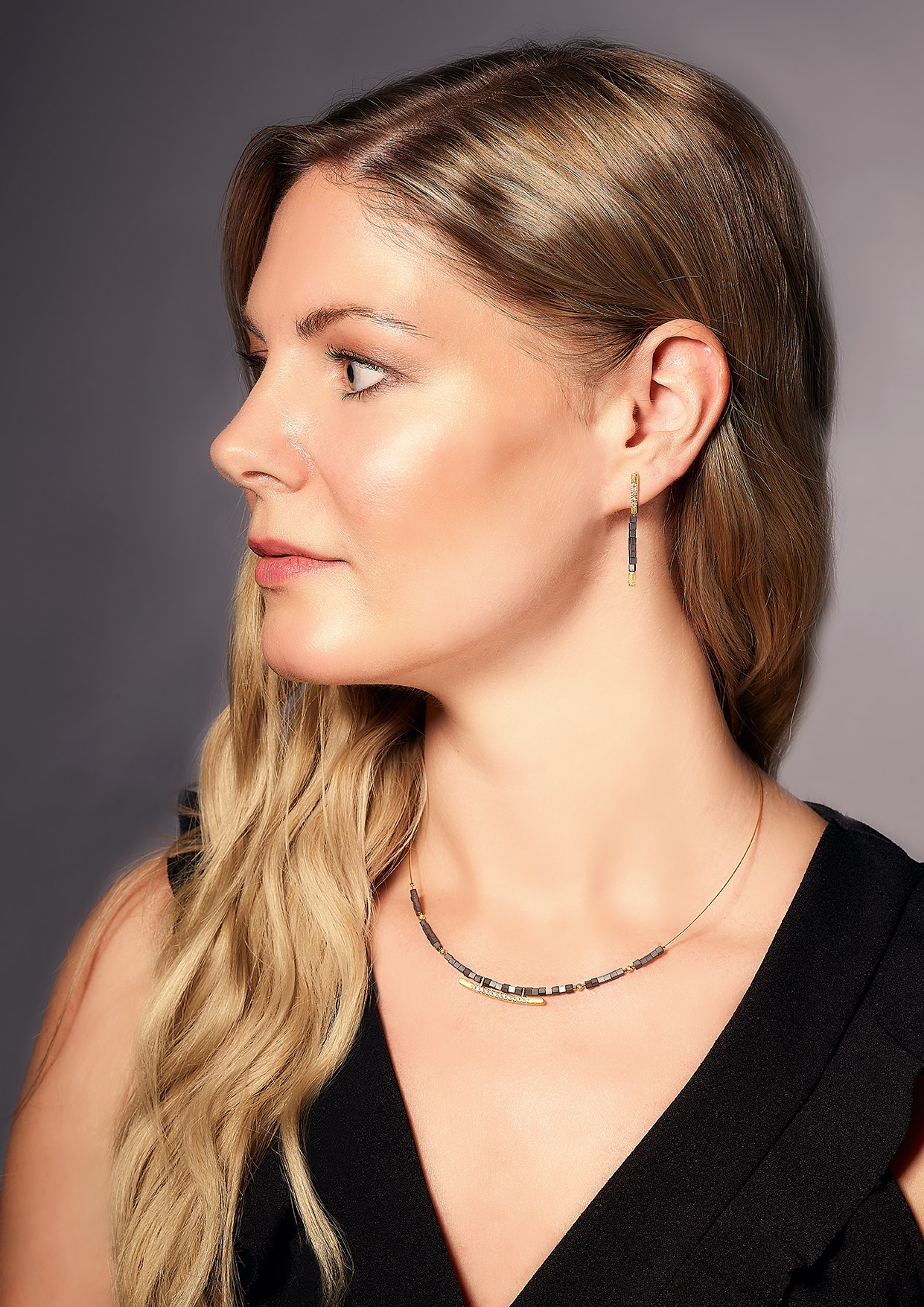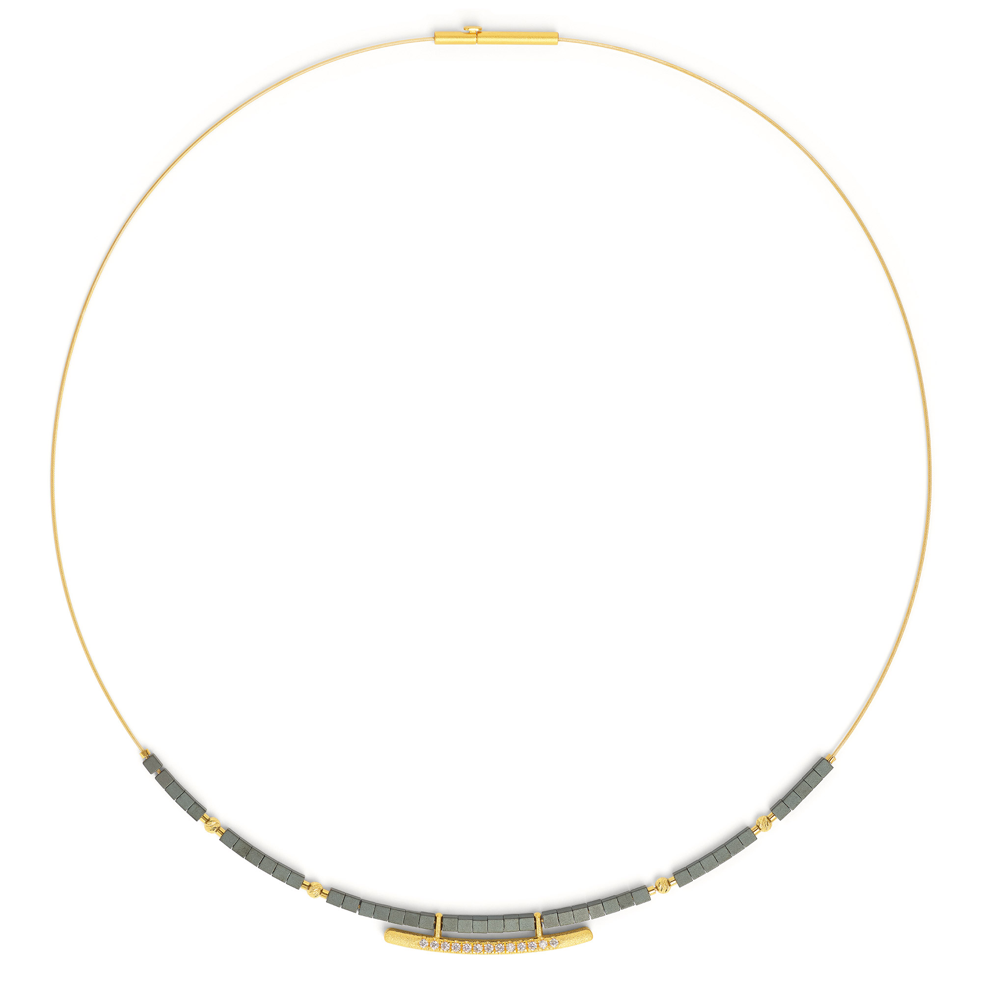 Der Halsschmuck SenSen hat einen zauberhaften, fernöstlichen Touch. Auf dem sanft gebogenen Stab, der unterhalb der matten Hämatinwürfel schwebt, glitzern dicht gefasste Zirkonia in Brillantschliff. Sie werden umrahmt von der mattgebürsteten Oberfläche im sonnig warmen Farbton der BERND WOLF 24-Karat-Goldplattierung in Premiumqualität und geben dem Collier eine ganz elegante Ausstrahlung.