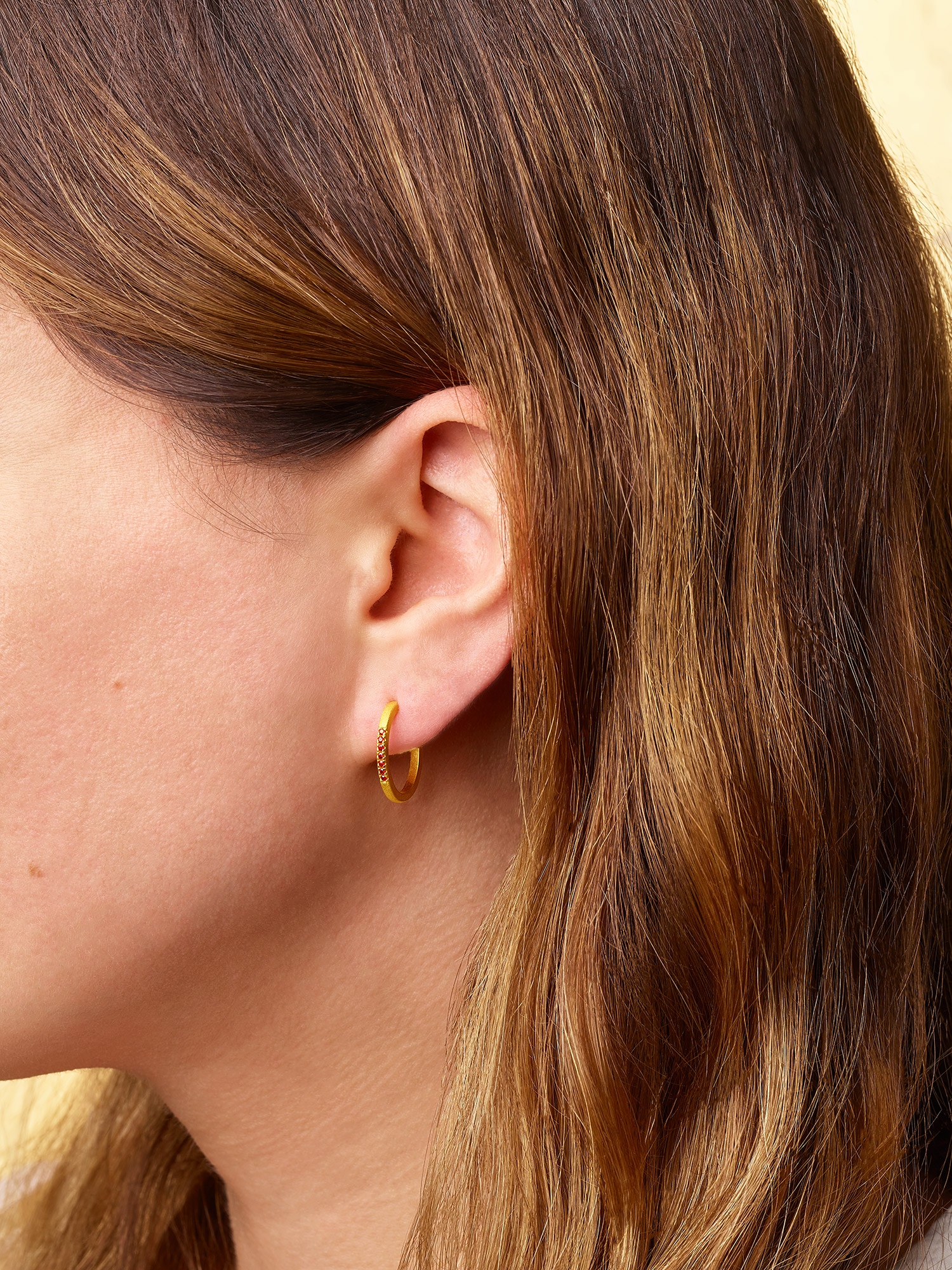 Seit mehr als 8000 Jahren tragen Frauen Creolen, sie sind damit die ältesten entdeckten Schmuckstücke. Auch heute zählen Creolen zu den beliebtesten Schmuckstücken. Die Creole Sentri umgibt das Ohr mit einem glitzernden Band aus rotem Granat. Dezent und elegant zugleich.