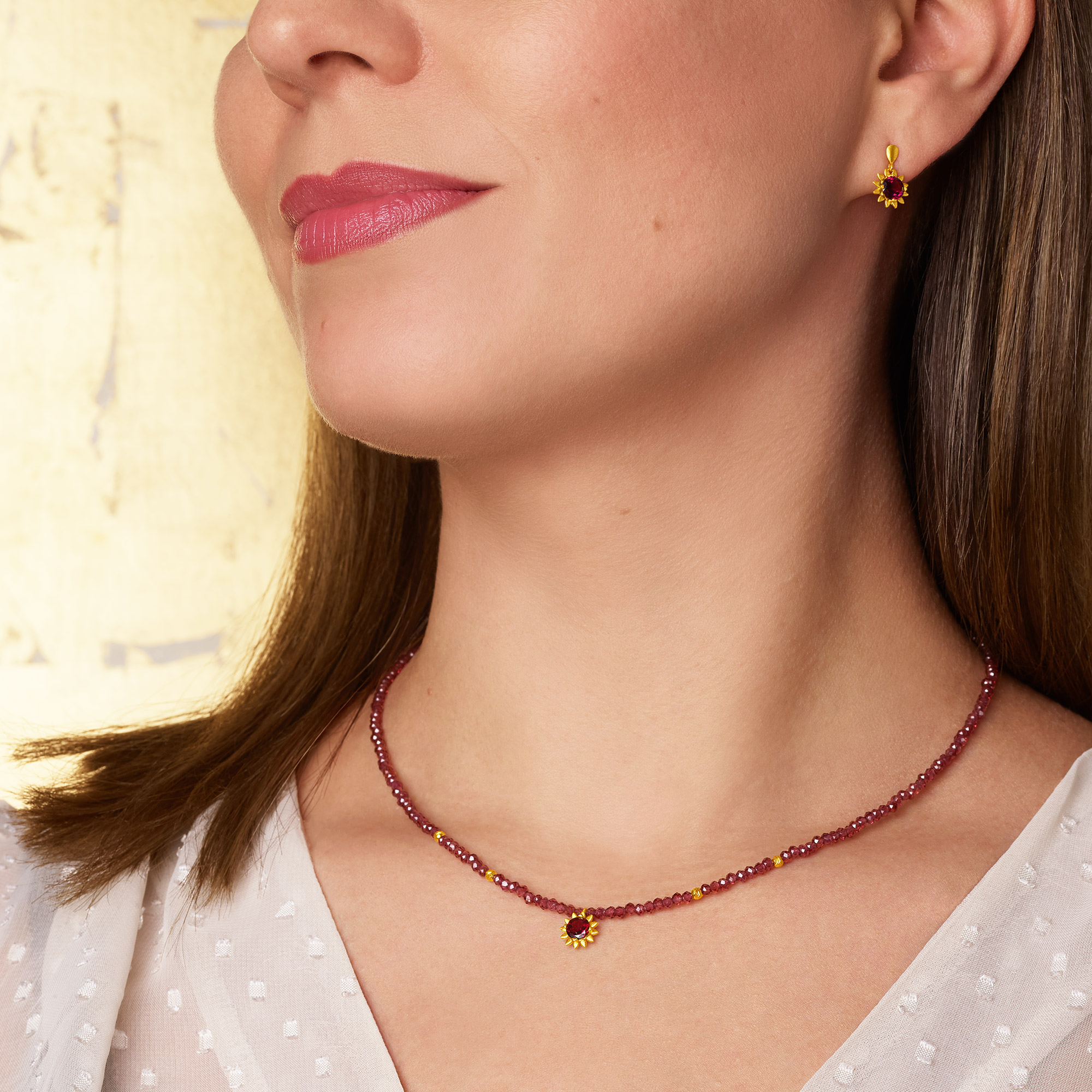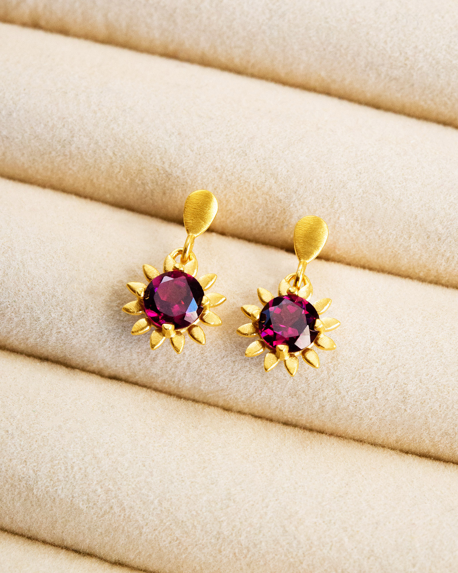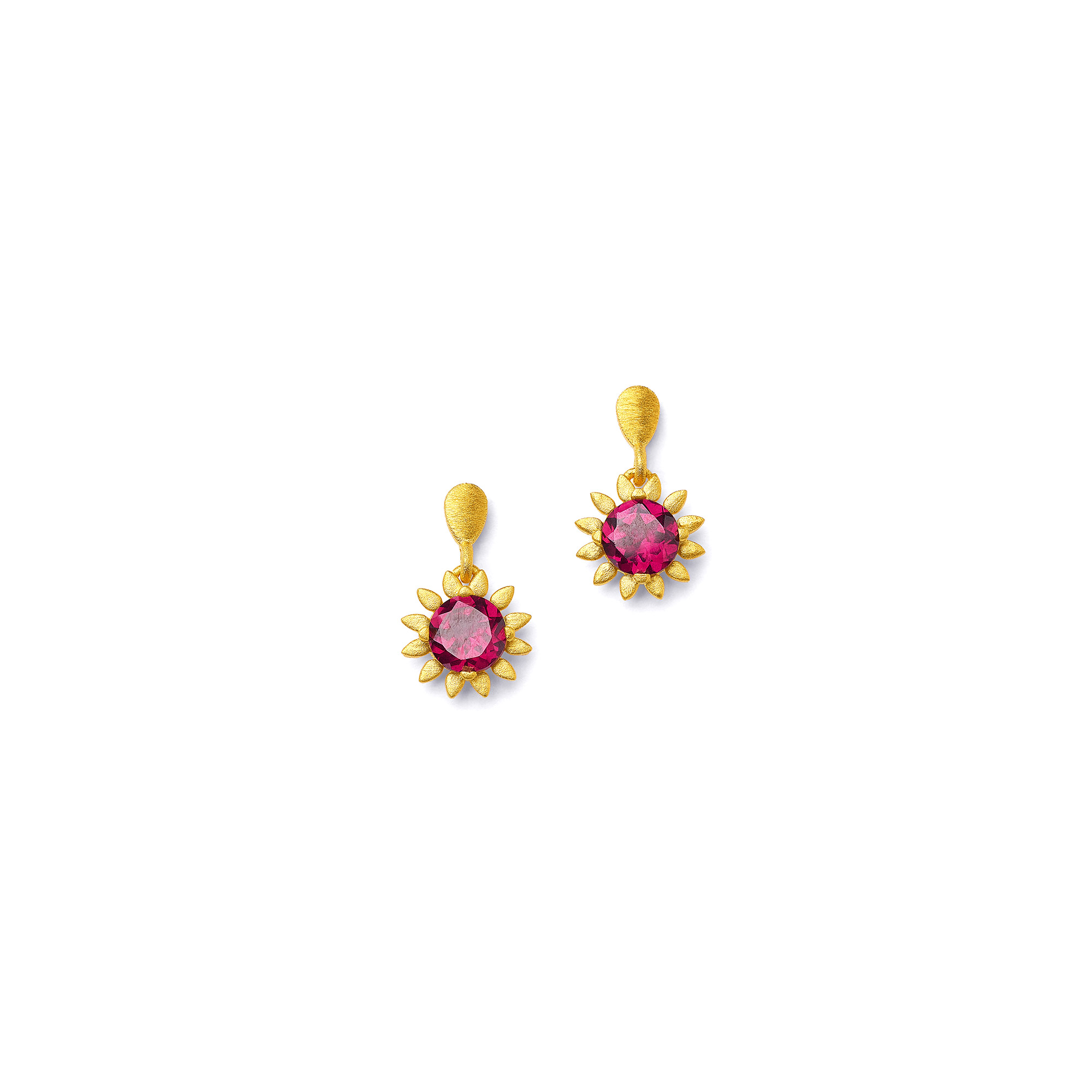 Die eleganten Ohrhänger aus der Aurum 585 Soleil Kollektion verzaubern mit purpurrotem Rhodolith im Brilliantschliff. Diese werden von kleinen, strichmattierten Sonnenstrahlen kunstvoll umrahmt und schwingen sanft an einem tropfenförmigen Stecker.