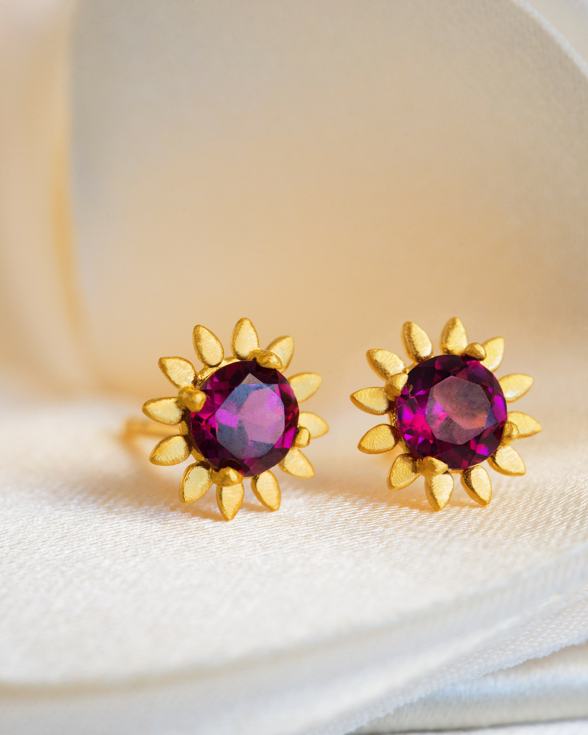 Die zarten Ohrstecker Soleil aus der Aurum 585 Soleil Kollektion verzaubern mit purpurroten Rhodolith im Brilliantschliff. Diese werden von kleinen, strichmattierten Sonnenstrahlen kunstvoll umrahmt und sind ein eleganter Hingucker der Extraklasse. Die Sonne zum Greifen nah: Mit der Aurum 585 Soleil Kollektion präsentiert BERND WOLF neue leuchtende Blickfänge. Die Sonne, ewige Quelle des Lebens, ist schon lange eine Muse für neue Kreation von Bernd Wolf. Der Clou der Aurum 585 Kollektion liegt im Kern, denn jedes Schmuckstück besteht aus massivem Gold 585 und wird mit der für BERND WOLF typischen 24-Karat-Goldplattierung in Premiumqualität veredelt.