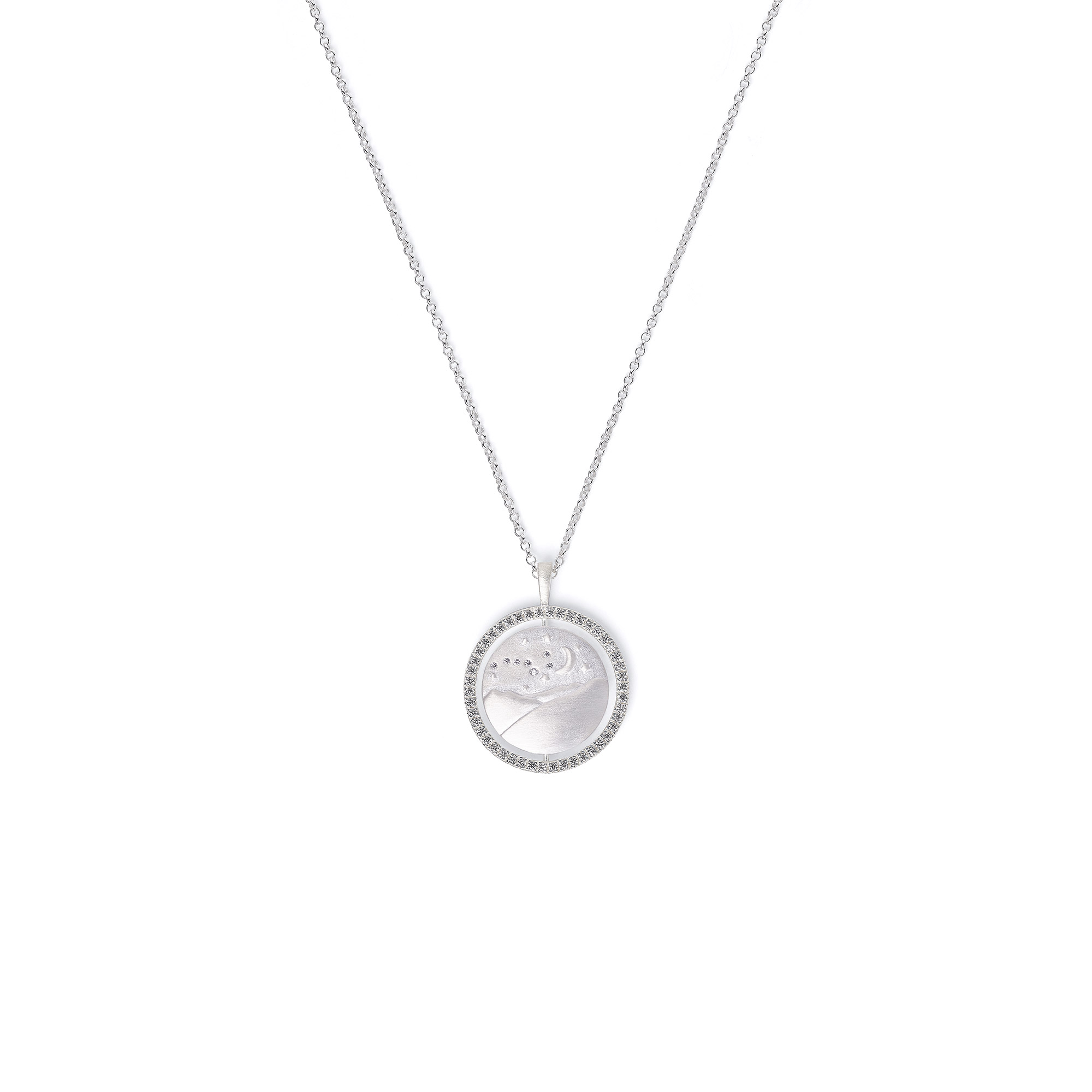 Der drehbare Anhänger der SUN&MOON Halskette zeigt eine wunderschöne Bergsilhouette, die auf auf einer Seite mit dem Mond und dem Sternbild des großen Wagens ergänzt wird und auf der anderen mit einer strahelnden Sonne. Die in das Schmuckstück eingelassenen Zirkoniasteine lassen es hochwertig funkeln. Ein funkelndes Lichterspiel im Wechsel von Tag und Nacht: Die Designlinie SUN&MOON ist wunderbar verwandelbar. Inspiriert von der Symphonie von Tag und Nacht, strahlt auf der einen Seite die Sonne und auf der anderen Seite der Mond am Himmel.