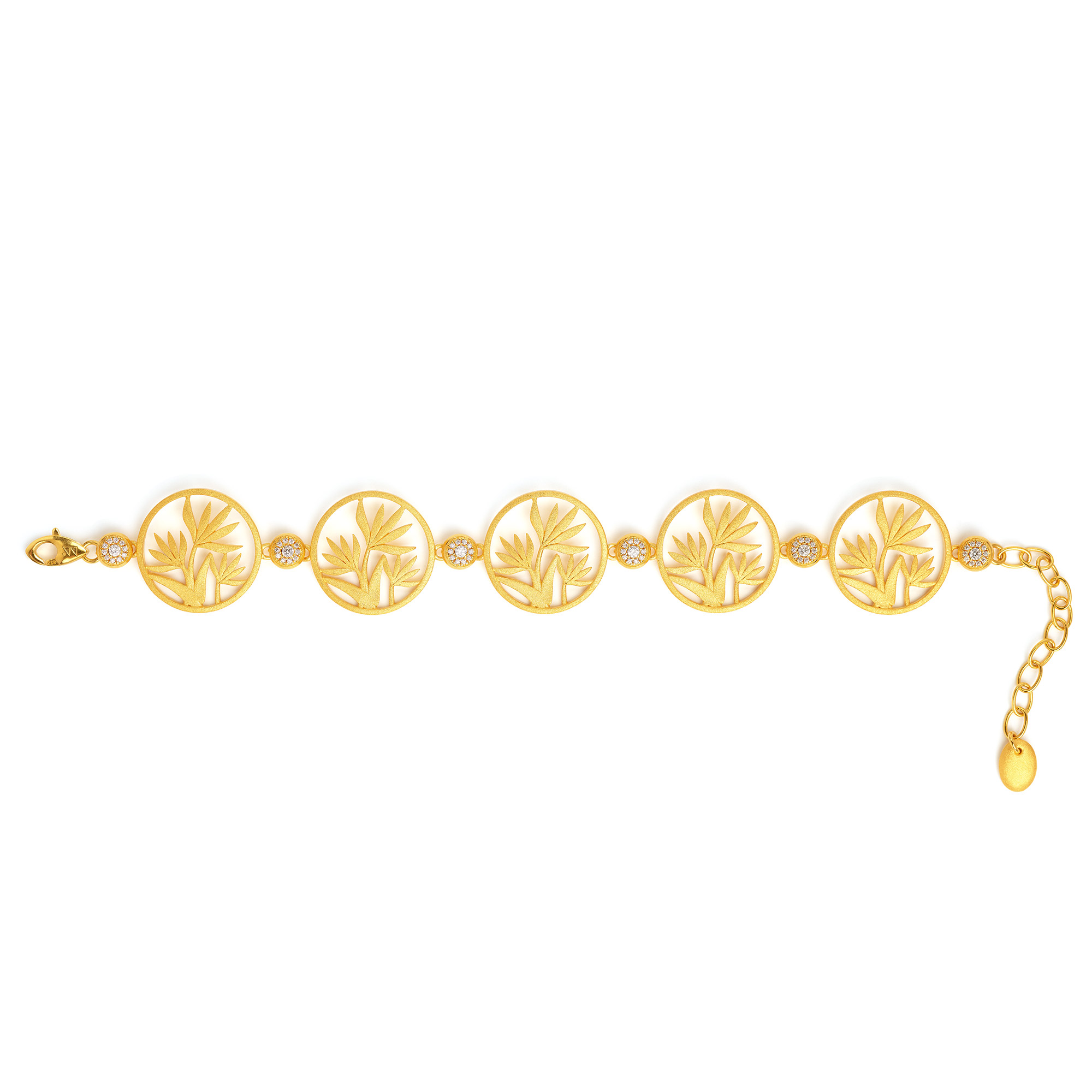 Die Armkette Strelana ist ein Highlight der neuen Designlinie Streliza. Fünf Kreise bergen in ihrer Mitte eine ausgewogene Komposition der Blätter der Designlinie Streliza Brillant geschliffene Zirkonia in runder Pavéfassung - wie glitzerne Knöpfe - sind leicht beweglich zwischen den Scheiben montiert und sorgen mit ihren lebendigen Reflexen für eine modisch exklusive Ausrichtung.