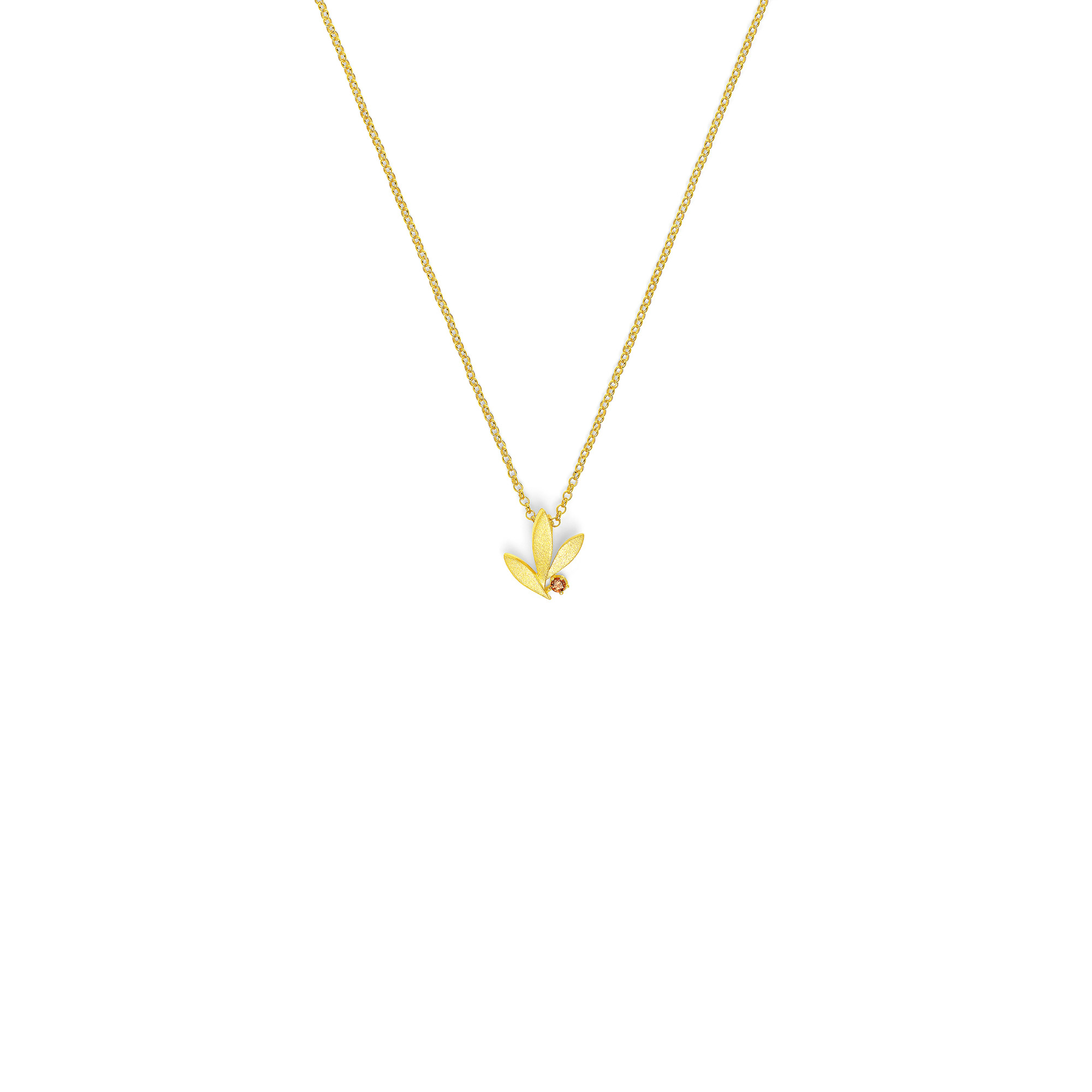 Mit dem Anhänger Strelisa ist der Designerin Yvonne Wolf ein romantisch verspieltes Schmuckstück gelungen, das mit duftiger Leichtigkeit an Sonne und Sommer erinnert. Der rote Granat im Brillantschliff setzt einen sinnlichen Akzent an die Spitzen der drei schlanken Blätter. Die Kette kann 41 und 45cm lang getragen werden. Zusammen mit dem ebenso zarten Ring Strelisa und den Ohrsteckern Strelisa bildet das Collier ein wunderschönes Set, dass jederzeit und zu jedem Anlass bezaubernd schmückt.