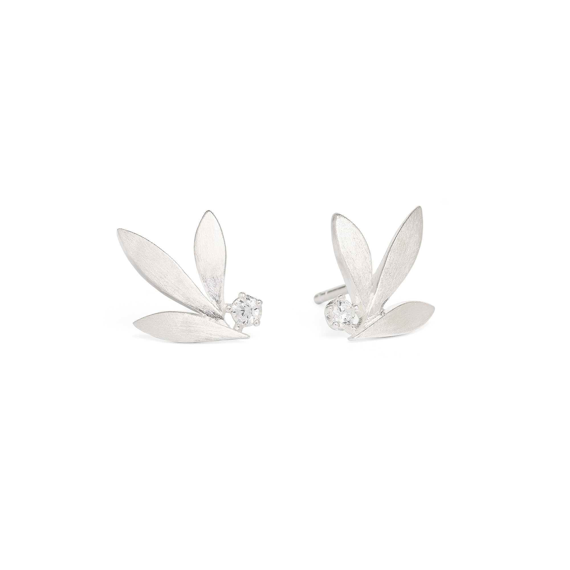 Drei schlanke Blätter des Ohrsteckes Strelisa werden von einem kleinen Zirkonia ergänzt, der mit seinem Brillantschliff einen hellen, glitzernden Akzent setzt. Die Fassung des Steines mit fünf Krappen betont die Leichtigkeit der Stecker - fast wie von einem Sommerwind spielerisch ans Ohr geweht.