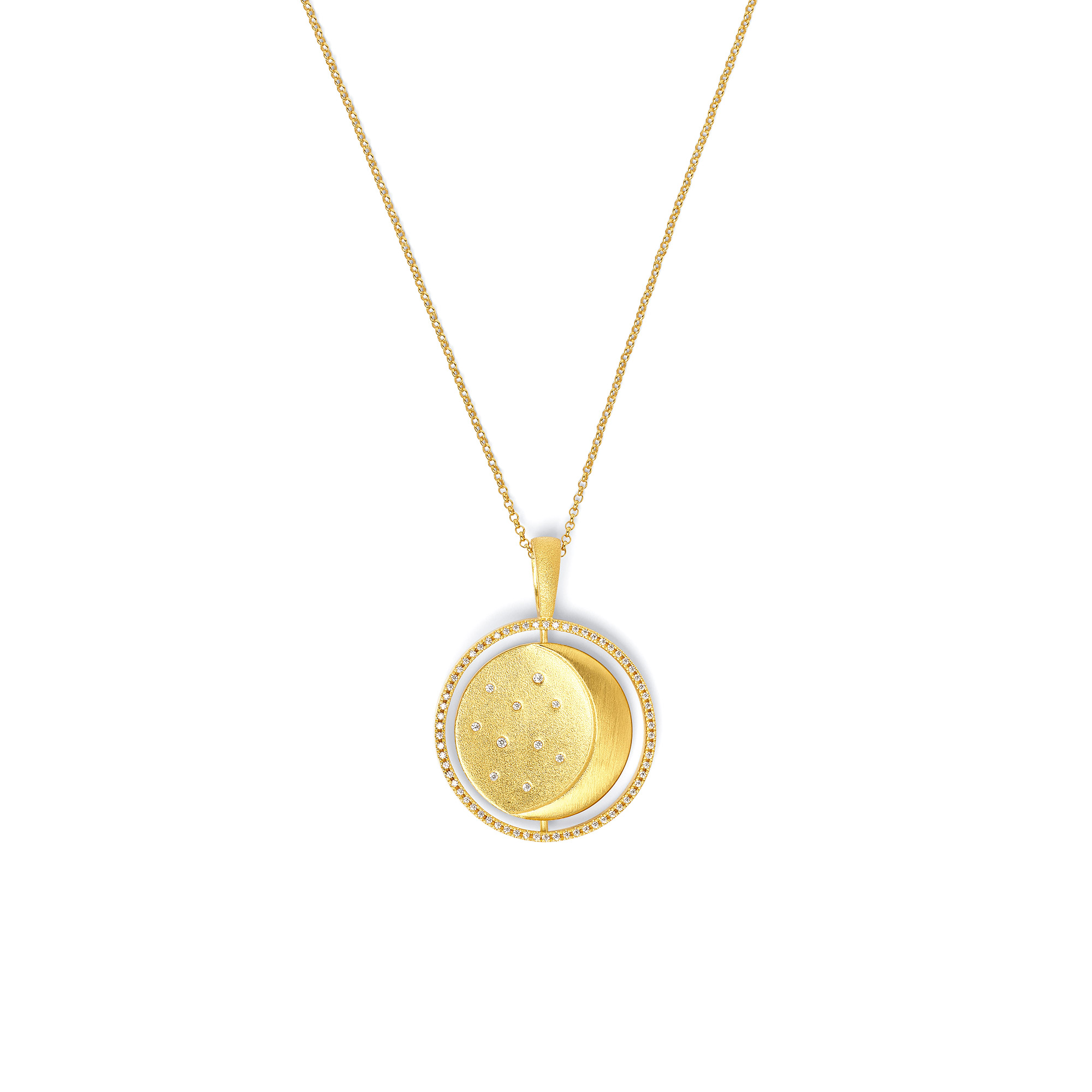 Der große Sun-Moon Anhänger ist wunderbar verwandelbar. Die Scheibe im Zentrum lässt sich spielerisch um die eigene Achse drehen, so dass entweder Sonne oder Mond erscheint. Die Scheibe wird umgeben von einem glitzernden Sternenband mit funkelnden Zirkonia und hat einen Durchmesser von 33mm. So verbindet der Anhänger aus BERND WOLF's Designlinie Pirouette Sonne und Mond und Tag und Nacht auf bezaubernde Weise. Lassen Sie die Sonne scheinen, wann immer es Ihnen gefällt und freuen Sie sich, wenn der zauberhafte Sichelmond zum Träumen einlädt.
