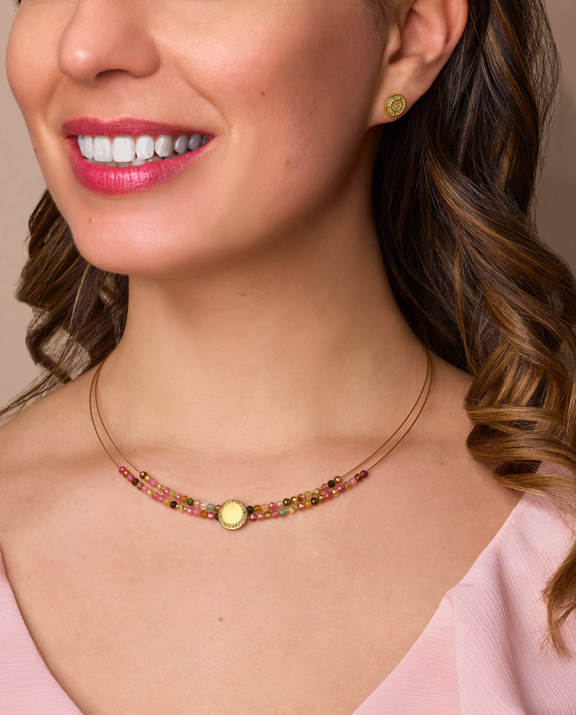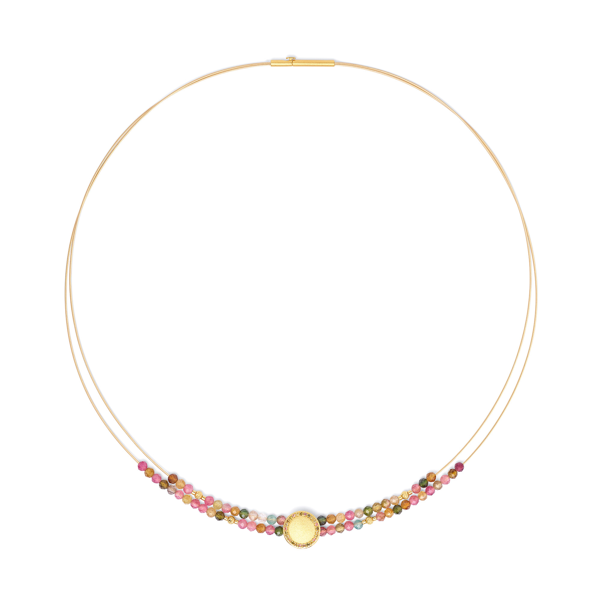 Im Zentrum des Seilcolliers Suntini strahlt eine bezaubernde Sonnenscheibe, die von vielfarbigen, edlen Turmalinen in Brillantschliff umgeben ist. Auf den vergoldeten und hochflexiblen Seilen sind facettierte Turmalinperlen in besonderer Qualität aufgereiht. Die vergoldeten, ummantelten Edelstahlseile schmiegen sich mit höchstem Tragekomfort seidig an den Hals. Der bewährte BERND WOLF Tastenverschluss macht das Anlegen einfach und sicher. Lassen Sie die Sonne scheinen mit der sonnigen, warmen BERND WOLF 24-Karat-Goldplattierung in Premiumqualität und diesem besonderen Schmuckstück.