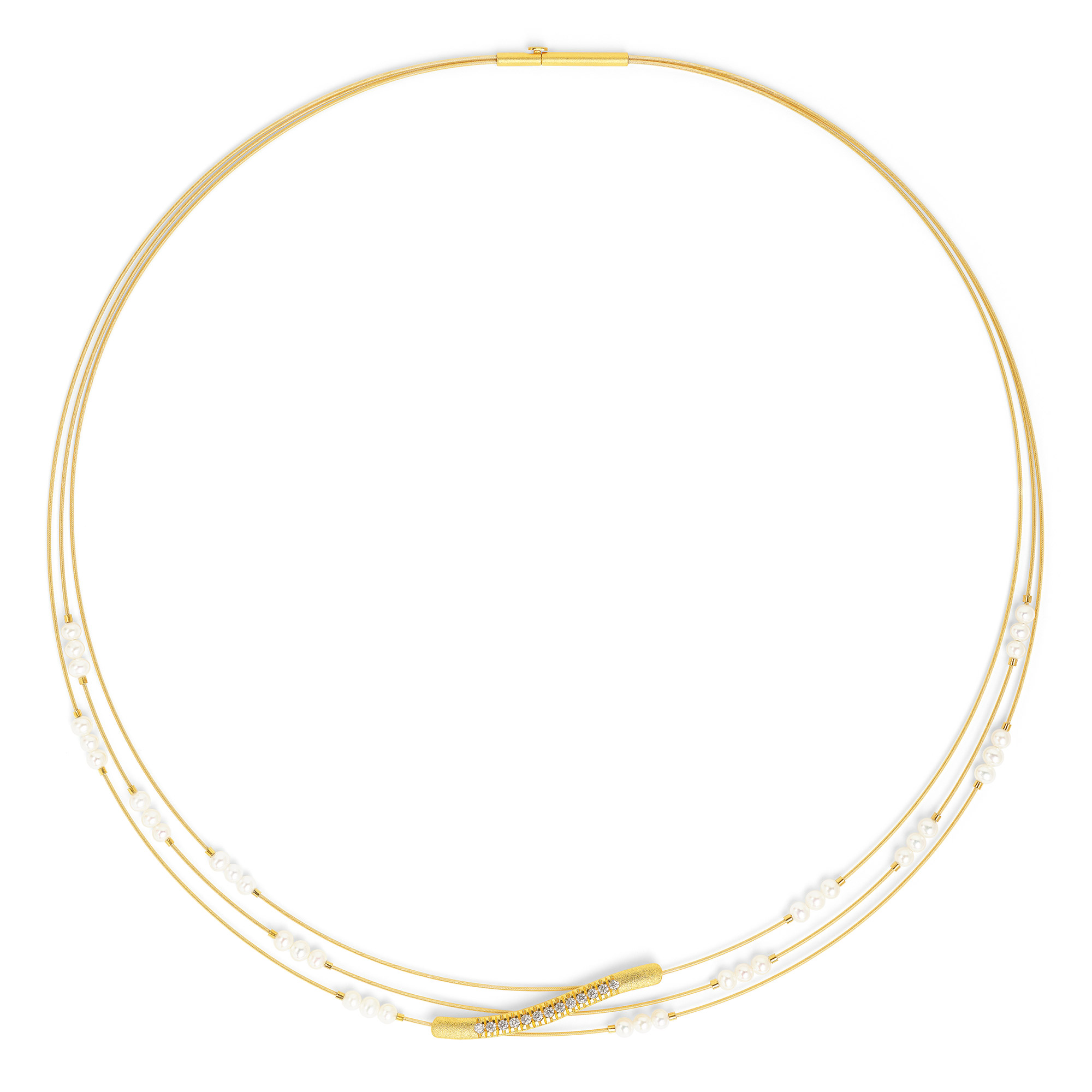 Sanft geschwungen bildet ein weich abgerundeter Stab das dekorative Mittelteil des dreireihigen Colliers Uprise. Die dicht gefassten Zirkonia Steine glitzern hell und beleben das Collier mit ihrem Glanz. Sanft schimmernde Süßwasserperlen sind in Gruppen zu je drei auf den speziell für Bernd Wolf gefertigten hochflexiblen Feinseilen fixiert und geben dem Halsschmuck eine elegante Anmutung.