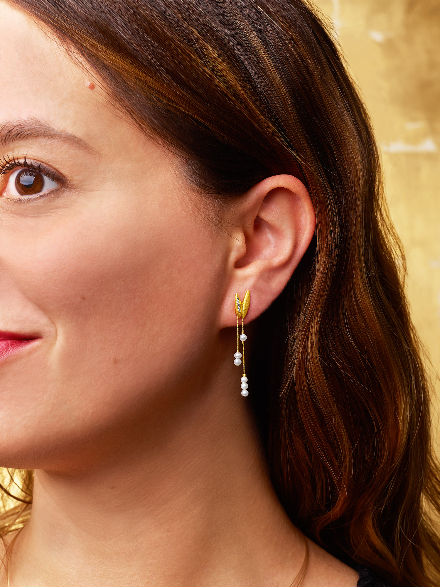 Zwei schiffchenförmige, gebürstet Elemente in sonniger 24-Karat-Goldplattierung bilden den Verschluss des Ohrsteckers Venalis. Zirkonia in Brillantschliff bildet einen besonderen Akzent durch die Fassung in einem schlanken, navetteförmigen Kanal. Auf zwei feinen Kettchen, exklusiv für BERND WOLF gefertigt, strahlen Süßwasserperlen mit magischem Lüster. Sanft schwingen die Kettchen bei jeder Bewegung in spielerischer Leichtigkeit.