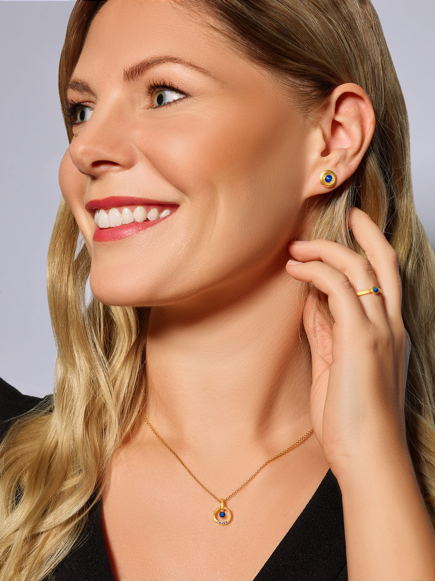 Der Anhänger Volta bezaubert mit der frei beweglichen Verbindung einer royal magisch funkelnden, facettetierten Kyanit Kugel in einem matten, gebürsteten Rahmen in BERND WOLF 24-Karat-Goldplattierung in Premiumqualität. Im unteren Teil des Rahmens glitzern neun edle himmelblaue Saphire. Wie der gleichnamige Paartanz aus vergangenen Zeiten ist die Kette Volta ein temperamentvolles Zusammenspiel gegensätzlicher Elemente. Die Kette kann durch eine Zwischenöse 41cm und 45cm lang getragen werden.